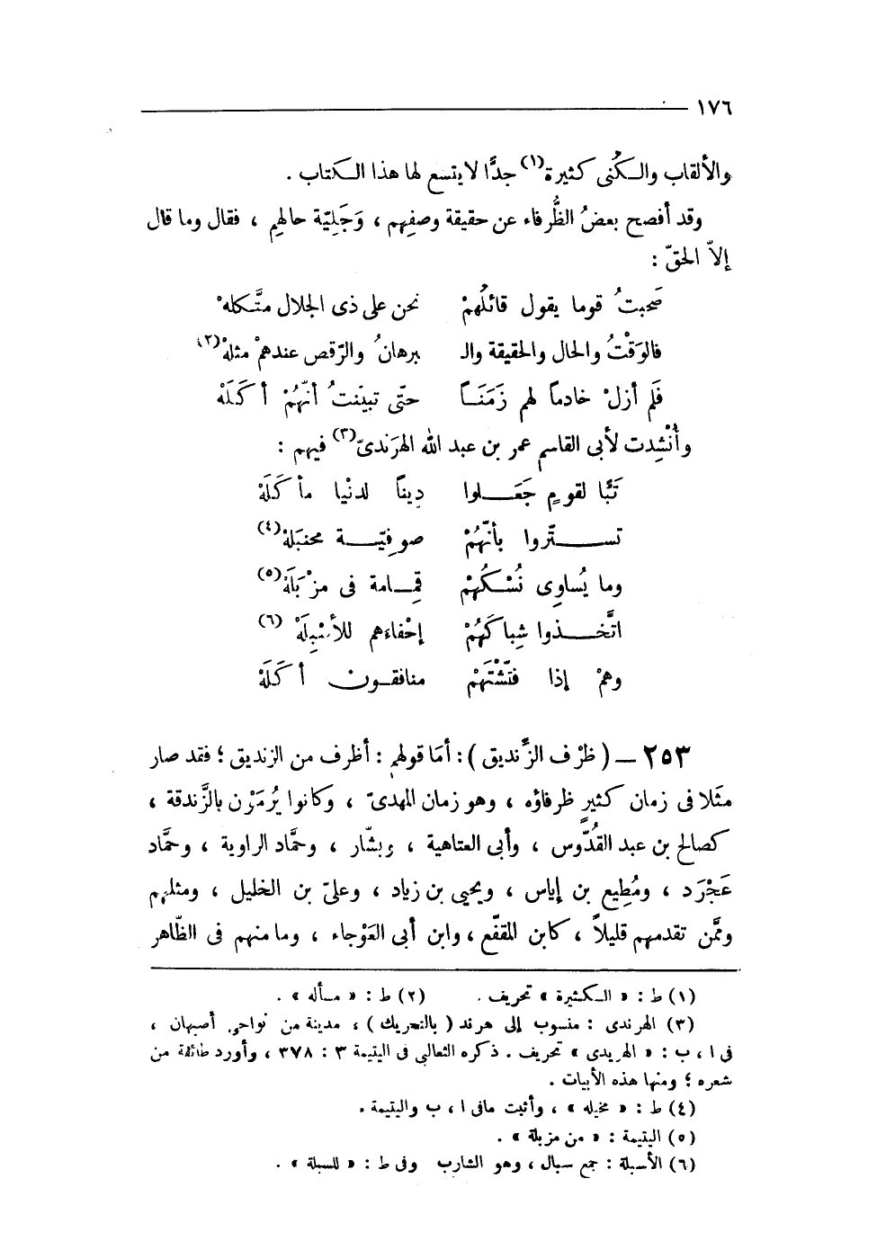 253 - (ظرف الزنديق) أما قَوْلهم أظرف من الزنديق فقد صَار مثلا فى زمَان كثير ظرفاؤه وَهُوَ زمَان المهدى وَكَانُوا يرْمونَ بالزندقة كصالح بن عبد القدوس وأبى الْعَتَاهِيَة وبشار وَحَمَّاد الراوية وَحَمَّاد عجرد ومطيع بن إِيَاس وَيحيى بن زِيَاد وعَلى بن الْخَلِيل وَمثلهمْ وَمِمَّنْ تقدمهم قَلِيلا كَابْن المقفع وَابْن أَبى العوجاء وَمَا مِنْهُم فى الظَّاهِر