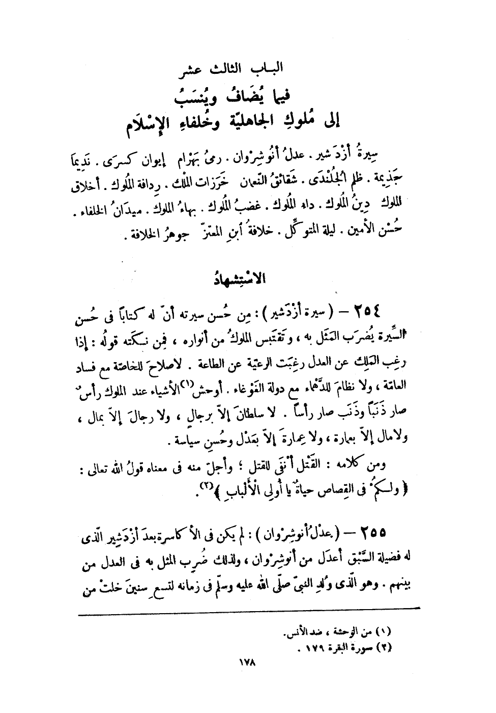 255 - (عدل أنو شرْوَان) لم يكن فى الأكاسرة بعد أزدشير الذى لَهُ فَضِيلَة السَّبق أعدل من أنو شرْوَان وَلذَلِك ضرب الْمثل بِهِ فى الْعدْل من بَينهم وَهُوَ الذى ولد النَّبِي صلى الله عَلَيْهِ وَسلم فى زَمَانه لتسْع سِنِين خلت من