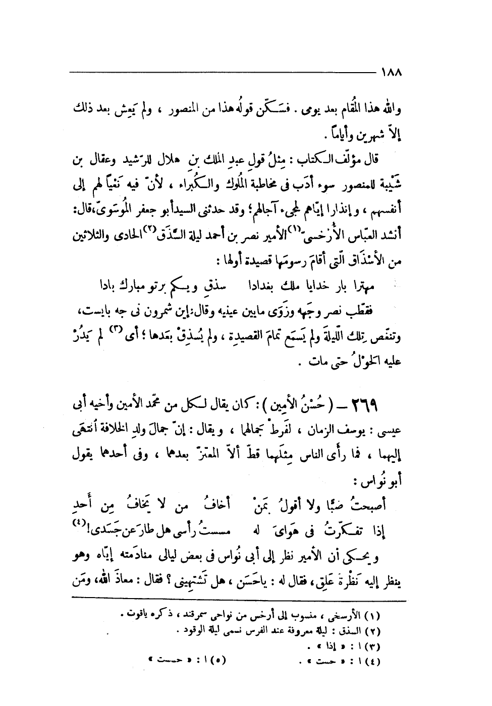 269 - (حسن الْأمين) كَانَ يُقَال لكل من مُحَمَّد الْأمين وأخيه أَبى عِيسَى يُوسُف الزَّمَان لفرط جمالهما وَيُقَال إِن جمال ولد الْخلَافَة انْتهى إِلَيْهِمَا فَمَا رأى النَّاس مثلهمَا قطّ أَلا المعتز بعدهمَا وفى أَحدهمَا يَقُول أَبُو نواس