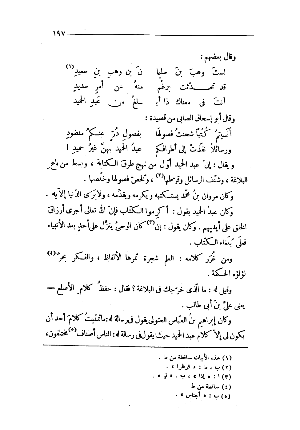 وَكَانَ إِبْرَاهِيم بن الْعَبَّاس الصولى يَقُول فى رِسَالَة لَهُ مَا تمنيت كَلَام أحد أَن يكون لى إِلَّا كَلَام عبد الحميد حَيْثُ يَقُول فى رِسَالَة لَهُ النَّاس أَصْنَاف مُخْتَلفُونَ