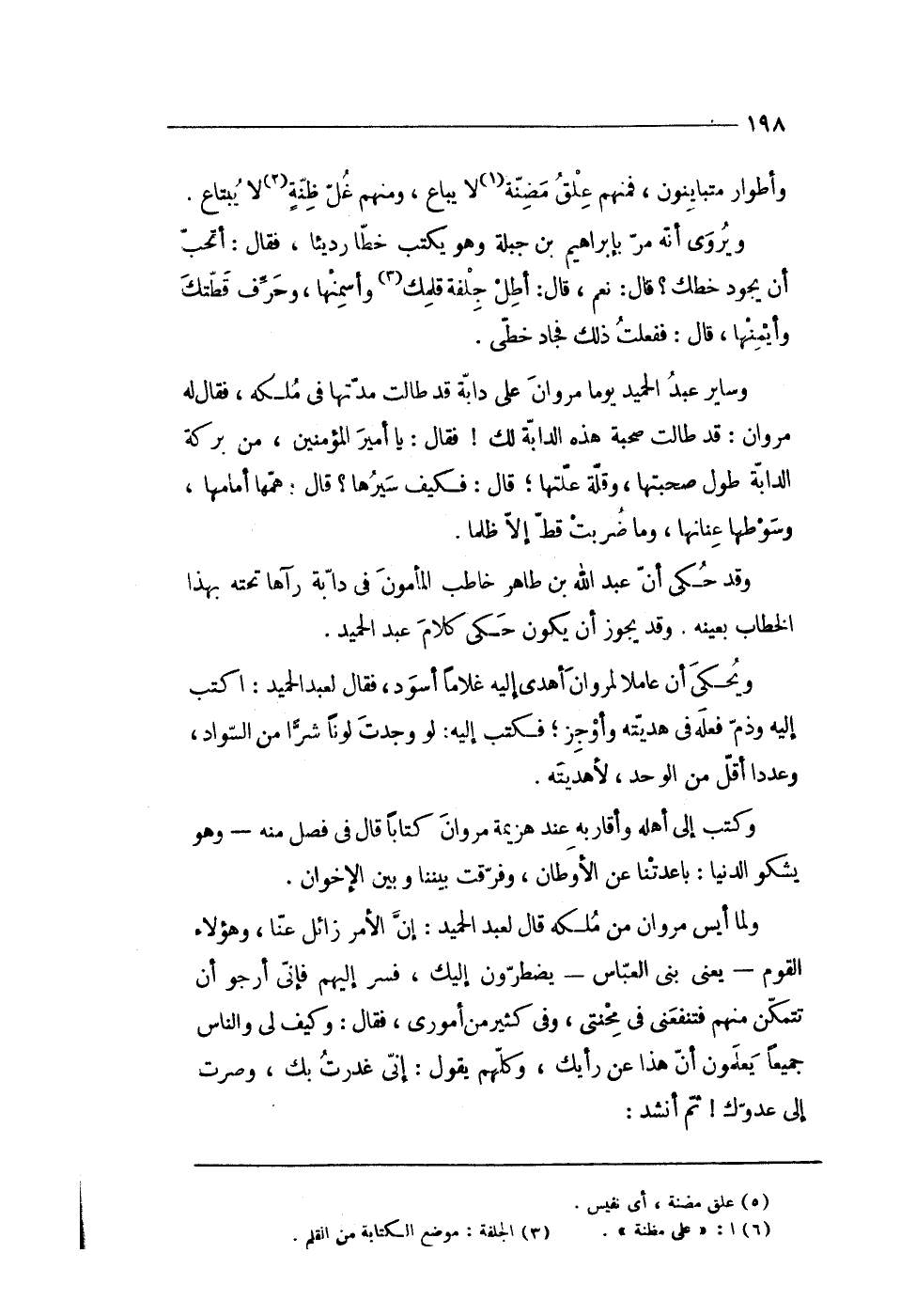وساير عبد الحميد يَوْمًا مَرْوَان على دَابَّة قد طَالَتْ مدَّتهَا فى ملكه فَقَالَ لَهُ مَرْوَان قد طَالَتْ صُحْبَة هَذِه الدَّابَّة لَك فَقَالَ يَا أَمِير الْمُؤمنِينَ من بركَة الدَّابَّة طول صحبتهَا وَقلة علتها قَالَ فَكيف سَيرهَا قَالَ همها أمامها وسوطها عنانها وَمَا ضربت قطّ إِلَّا ظلما