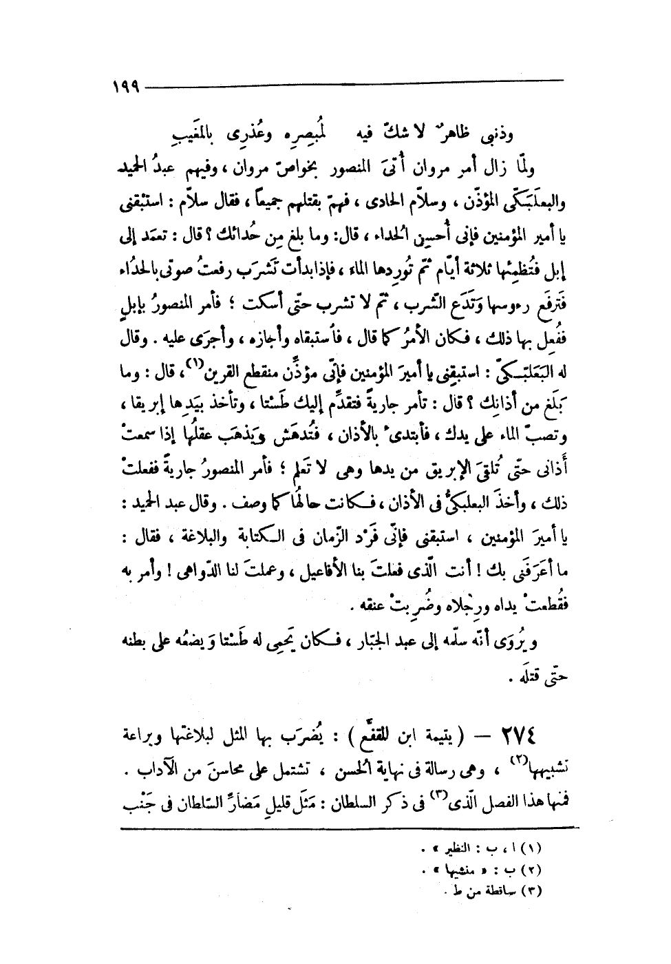 274 - (يتيمة ابْن المقفع) يضْرب بهَا الْمثل لبلاغتها وبراعة تشبيهها وهى رِسَالَة فى نِهَايَة الْحسن تشْتَمل على محَاسِن من الْآدَاب فَمِنْهَا هَذَا الْفَصْل الذى فى ذكر السُّلْطَان مثل قَلِيل مضار السُّلْطَان فى جنب