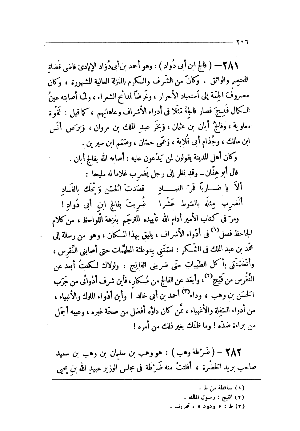 وَمر فى كتاب الْأَمِير أدام الله تأييده المترجم بنزهة اللواحظ من كَلَام الجاحظ فى أدواء الْأَشْرَاف يَلِيق بِهَذَا الْمَكَان وَهُوَ من رِسَالَة إِلَى مُحَمَّد بن عبد الْملك فى الشُّكْر نعمتنى بتوطئة المطهمات حَتَّى أصابنى النقرس وأتخمتنى بِأَكْل الطَّيِّبَات حَتَّى ضربنى الفالج ولولاك لَكُنْت أبعد عَن النقرس من فيج وَأبْعد عَن الفالج من مكار فَأَيْنَ شرف أدوائى من جرب الْحسن بن وهب وداء أَحْمد بن أَبى خَالِد وَأَيْنَ أدواء الْمُلُوك والأنبياء من أدواء السفلة والأغبياء مِمَّن كَانَ داؤه أفضل من صِحَة غَيره وعيبه أجمل من بَرَاءَة ضِدّه وَمَا ظَنك بِغَيْر ذَلِك من أمره