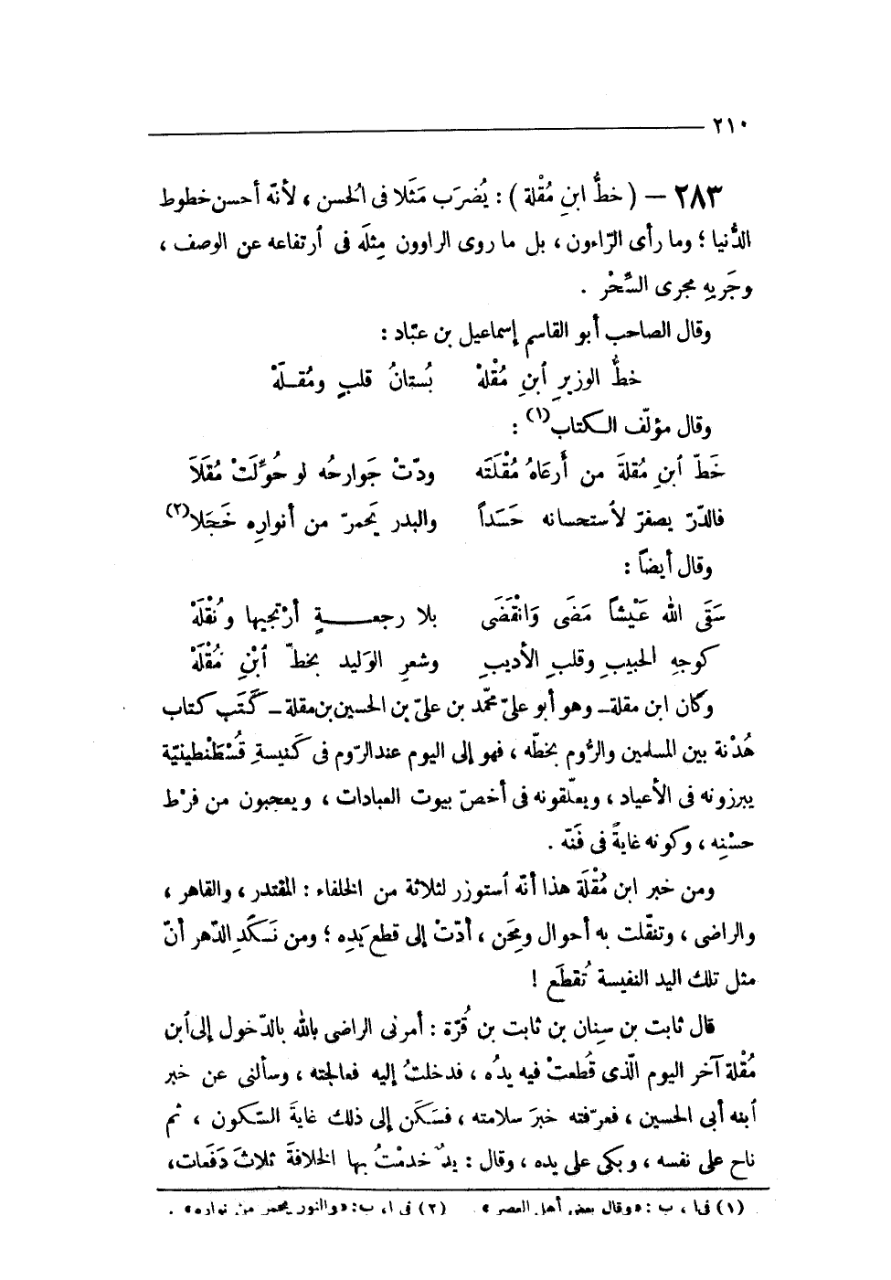 283 - (خطّ ابْن مقلة) يضْرب مثلا فى الْحسن لِأَنَّهُ أحسن خطوط الدُّنْيَا وَمَا رأى الراءون بل مَا روى الراوون مثله فى ارتفاعه عَن الْوَصْف وجريه مجْرى السحر