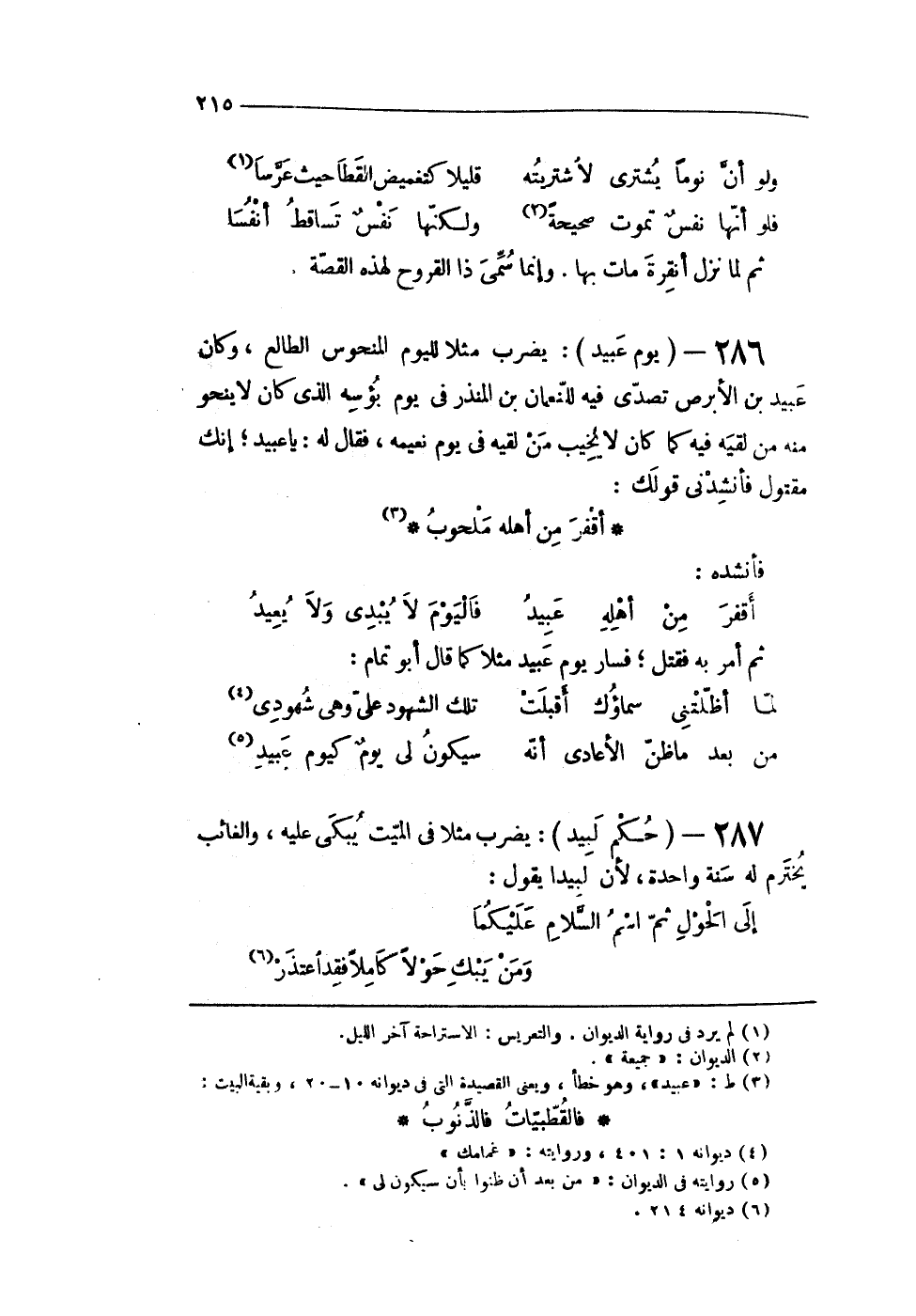 286 - (يَوْم عبيد) يضْرب مثلا لليوم المنحوس الطالع وَكَانَ عبيد بن الأبرص تصدى فِيهِ للنعمان بن الْمُنْذر فى يَوْم بؤسه الذى كَانَ لَا ينحو مِنْهُ من لقِيه فِيهِ كَمَا كَانَ لَا يخيب من لقِيه فى يَوْم نعيمه فَقَالَ لَهُ يَا عبيد إِنَّك مقتول فأنشدنى قَوْلك