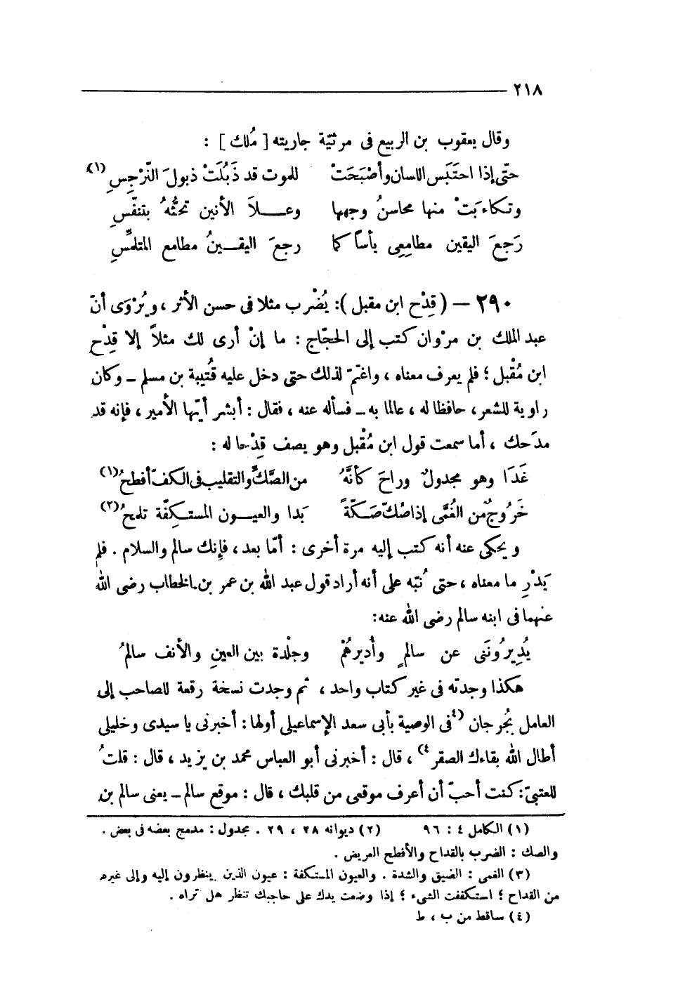 290 - (قدح ابْن مقبل) يضْرب مثلا فى حسن الْأَثر ويروى أَن عبد الْملك بن مَرْوَان كتب إِلَى الْحجَّاج مَا أَن أرى لَك مثلا إِلَّا قدح ابْن مقبل فَلم يعرف مَعْنَاهُ واغتنم لذَلِك حَتَّى دخل عَلَيْهِ قُتَيْبَة بن مُسلم وَكَانَ راوية للشعر حَافِظًا لَهُ عَالما بِهِ فَسَأَلَهُ عَنهُ فَقَالَ أبشر أَيهَا الْأَمِير فَإِنَّهُ قد مدحك أما سَمِعت قَول ابْن مقبل وَهُوَ يصف قدحا لَهُ