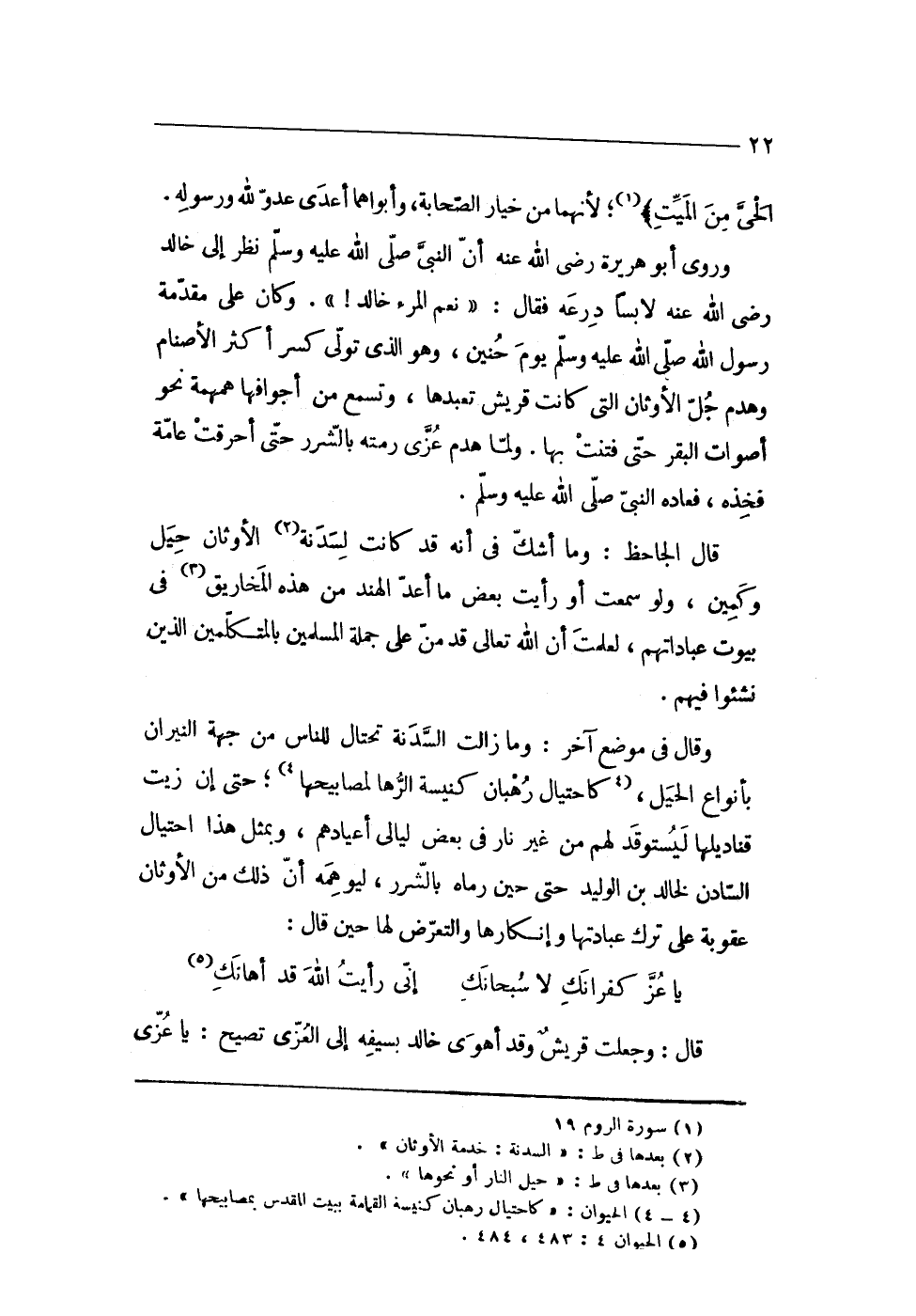 وَقَالَ فِي مَوضِع آخر وَمَا زَالَت السَّدَنَة تحتال للنَّاس من جِهَة النيرَان بأنواع الْحِيَل كاحتيال رُهْبَان كَنِيسَة الرها لمصابيحها حَتَّى إِن زَيْت قناديلها ليستوقد لَهُم من غير نَار فِي بعض ليالى أعيادهم وبمثل هَذَا احتيال السادن لخَالِد بن الْوَلِيد حَتَّى حِين رَمَاه بالشرر ليوهمه أَن ذَلِك من الْأَوْثَان عُقُوبَة على ترك عبادتها وإنكارها والتعرض لَهَا حِين قَالَ