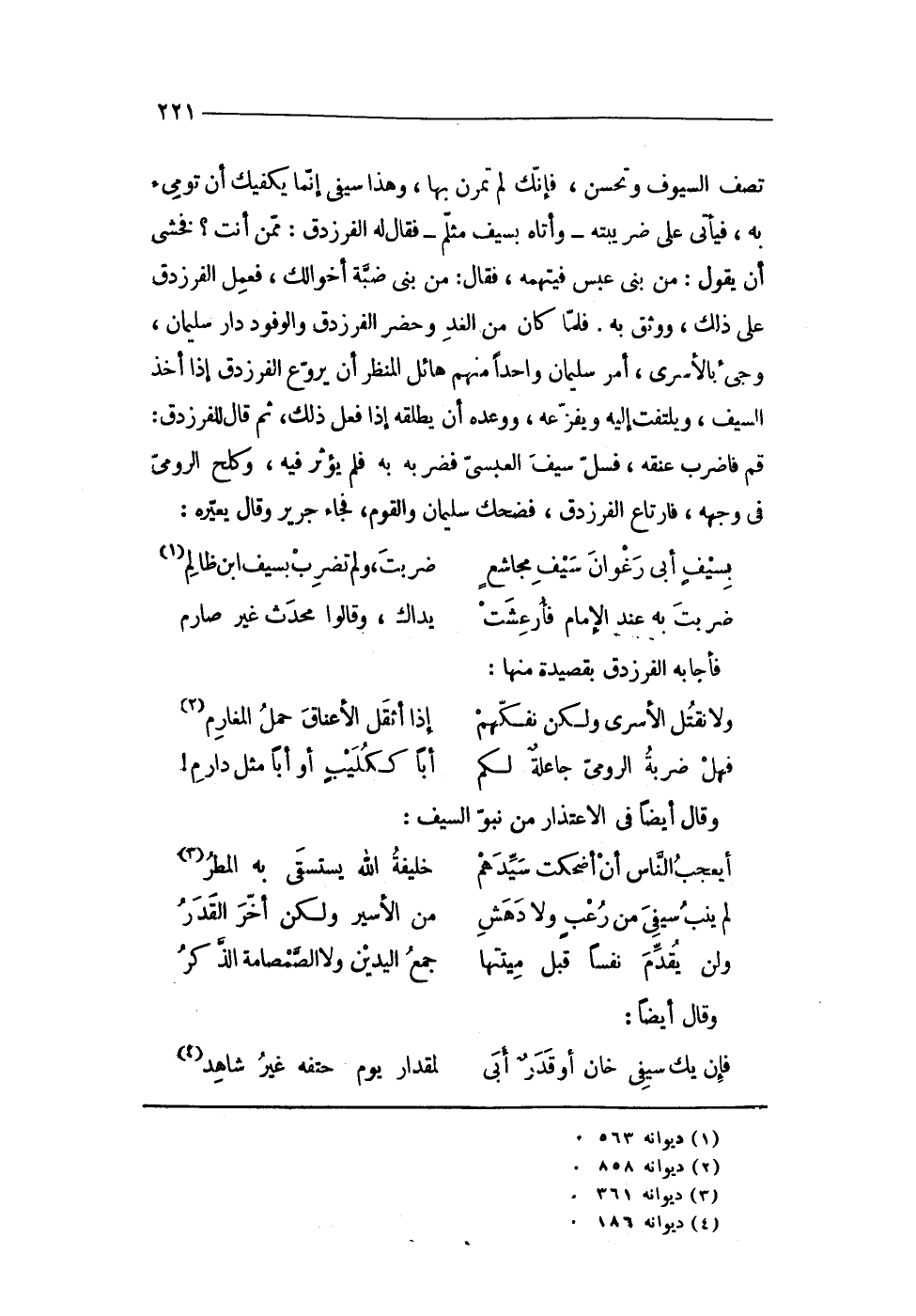 تصف السيوف وتحسن فَإنَّك لم تمرن بهَا وَهَذَا سيفى إِنَّمَا يَكْفِيك ان تومئ بِهِ فيأتى على ضريبته وَأَتَاهُ بِسيف مثلم فَقَالَ لَهُ الفرزدق مِمَّن أَنْت فخشى أَن يَقُول من بنى عبس فيتهمه فَقَالَ من بنى ضبة أخوالك فَعمل الفرزدق على ذَلِك ووثق بِهِ فَلَمَّا كَانَ من الْغَد وَحضر الفرزدق والوفود دَار سُلَيْمَان وجئ بالأسرى أَمر سُلَيْمَان وَاحِدًا مِنْهُم هائل المنظر أَن يروع الفرزدق إِذا أَخذ السَّيْف ويلفت إِلَيْهِ ويفزعه ووعده أَن يُطلقهُ إِذا فعل ذَلِك ثمَّ قَالَ للفرزدق قُم فَاضْرب عُنُقه فسل سيف العبسى فَضَربهُ بِهِ فَلم يُؤثر فِيهِ وكلح الرومى فى وَجهه فارتاع الفرزدق فَضَحِك سُلَيْمَان وَالْقَوْم فجَاء جرير وَقَالَ يعيره