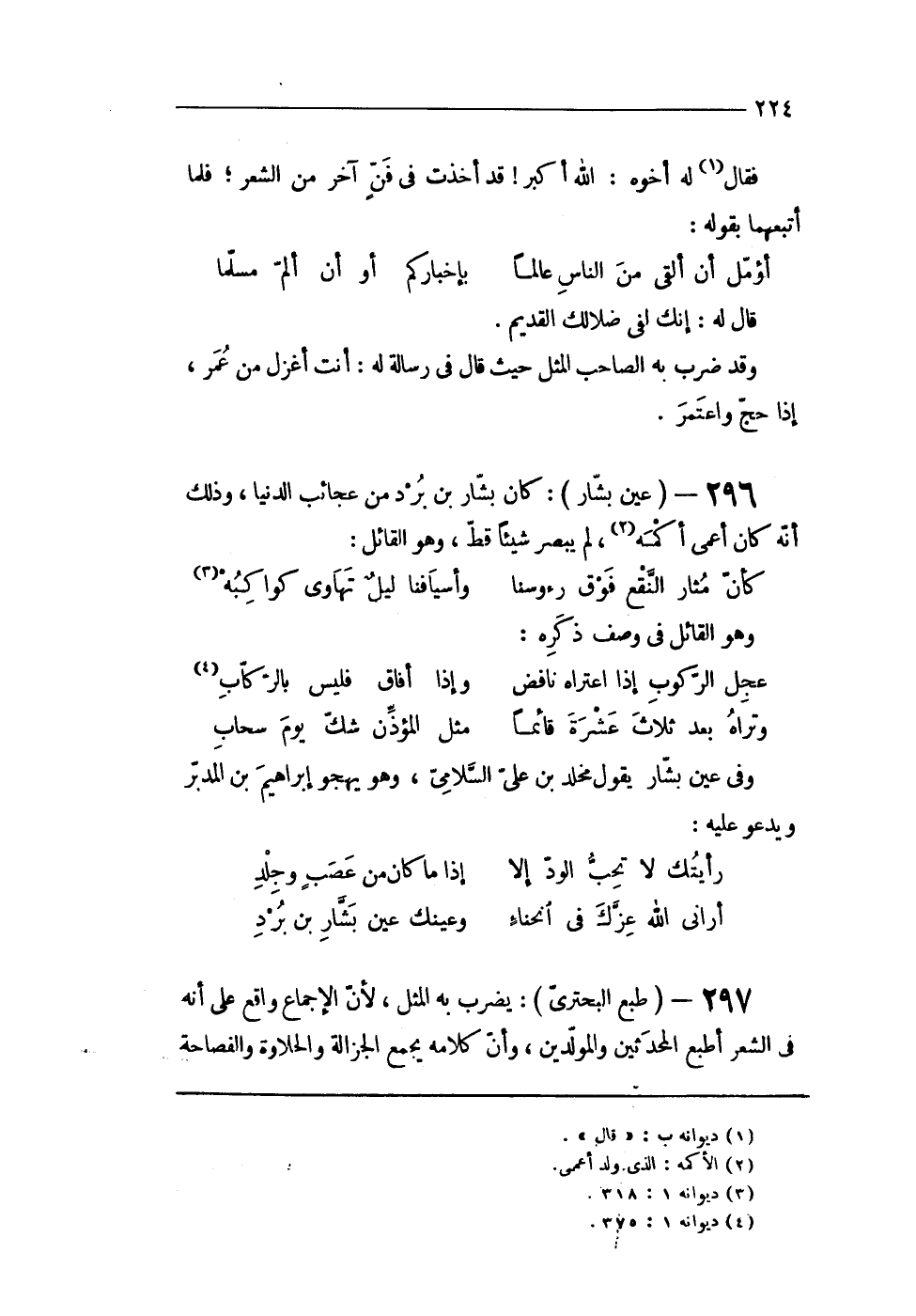 297 - (طبع البحترى) يضْرب بِهِ الْمثل لِأَن الْإِجْمَاع وَاقع على أَنه فى الشّعْر أطبع الْمُحدثين والمولدين وَأَن كَلَامه يجمع الجزالة والحلاوة والفصاحة