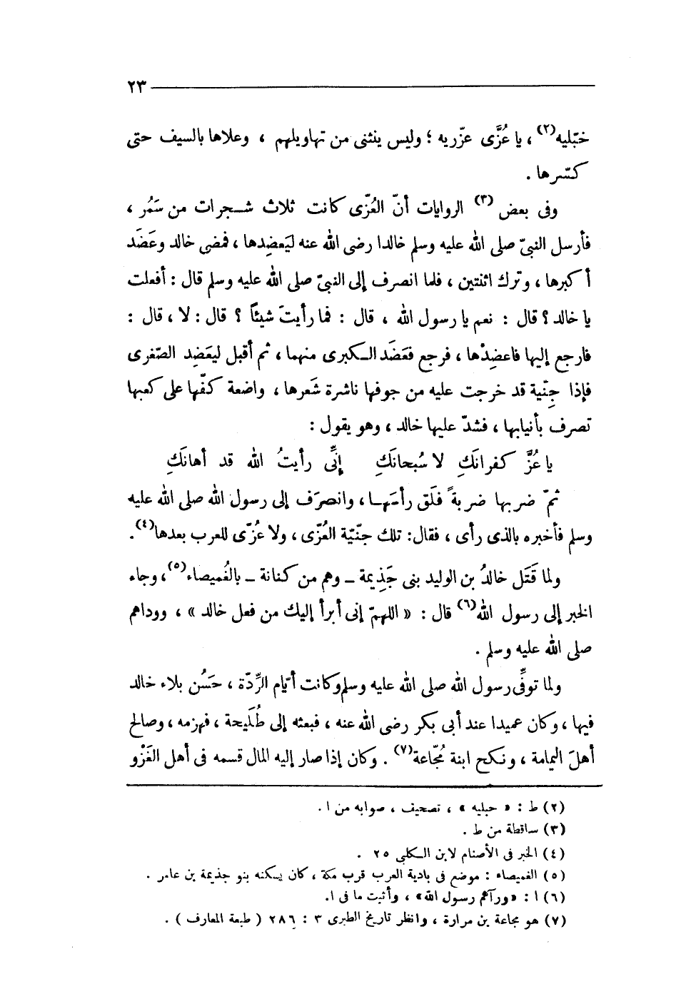 وَفِي بعض الرِّوَايَات أَن الْعُزَّى كَانَت ثَلَاث شجرات من سمر فأرس النَّبِي صلى الله عَلَيْهِ وَسلم خَالِدا رضى الله عَنهُ ليعضدها فَمضى خَالِد وعضد أكبرها وَترك اثْنَتَيْنِ فَلَمَّا انْصَرف إِلَى النَّبِي صلى الله عَلَيْهِ وَسلم قَالَ أفعلت يَا خَالِد قَالَ نعم يَا رَسُول الله صلى الله عَلَيْهِ وَسلم قَالَ فَمَا رَأَيْت شَيْئا قَالَ لَا قَالَ فَارْجِع إِلَيْهَا فاعضدها فَرجع فَعَضَدَ الْكُبْرَى مِنْهُمَا ثمَّ أقبل ليعضد الصُّغْرَى فَإِذا جنية قد خرجت عَلَيْهِ من جوفها نَاشِرَة شعرهَا وَاضِعَة كفها على كعبها تصرف بأنيابها فَشد عَلَيْهَا خَالِد وَهُوَ يَقُول