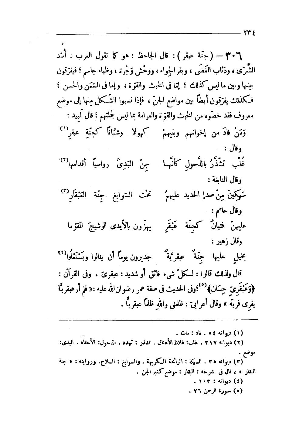 306 - (جنَّة عبقر) قَالَ الجاحظ هُوَ كَمَا تَقول الْعَرَب أَسد الشرى وذئاب الغضى وبقر الجواء ووحش وجرة وظباء جاسم فيفرقون بَينهَا وَبَين مَا لَيْسَ كَذَلِك إِمَّا فى الْخبث وَالْقُوَّة وَإِمَّا فى السّمن وَالْحسن فَكَذَلِك يفرقون أَيْضا بَين مَوَاضِع الْجِنّ فَإِذا نسبوا الشكل مِنْهَا إِلَى مَوضِع مَعْرُوف فقد خصوه من الْخبث وَالْقُوَّة والعرامة بِمَا لَيْسَ لجملتهم قَالَ لبيد