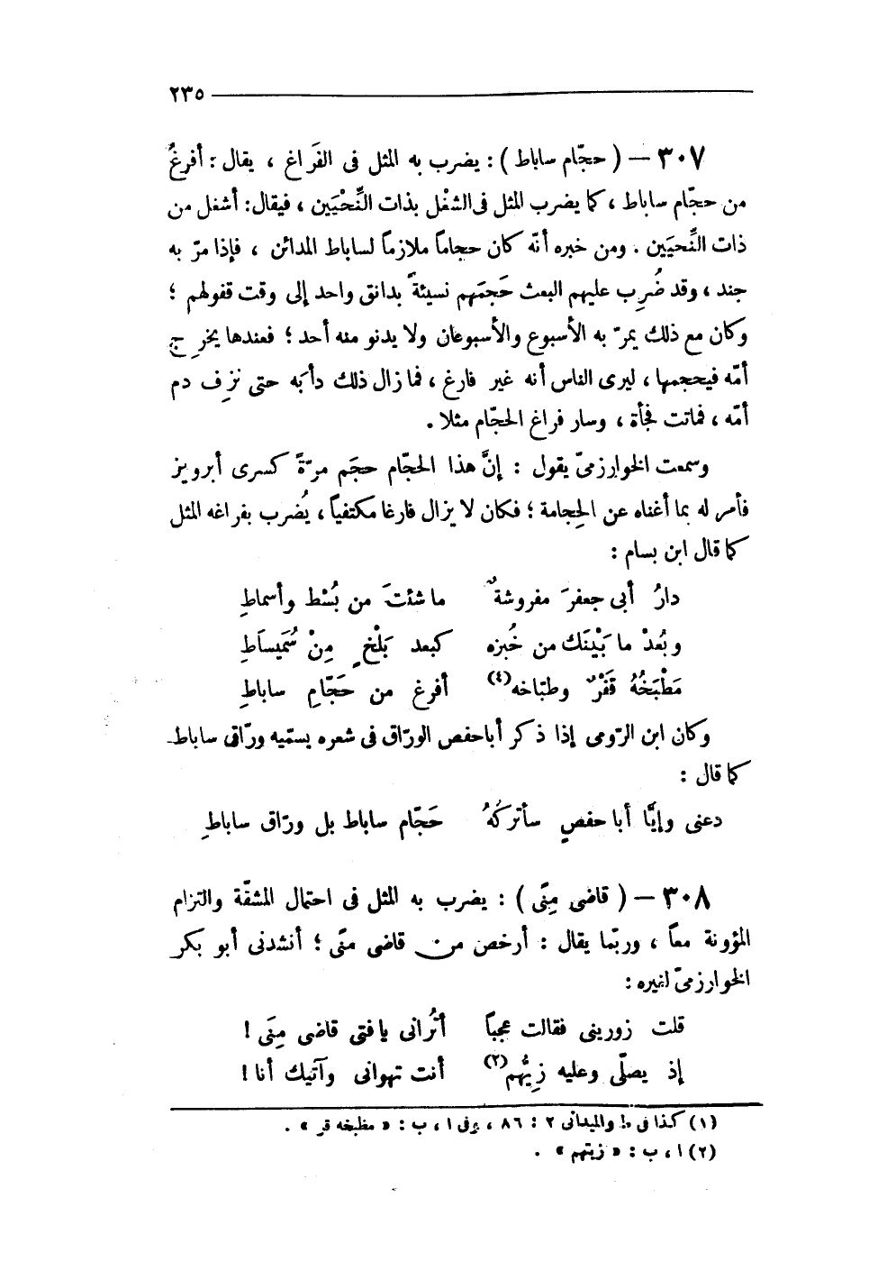 308 - (قاضى منى) يضْرب بِهِ الْمثل فى احْتِمَال الْمَشَقَّة والتزام المؤونة مَعًا وَرُبمَا يُقَال أرخص من قاضى منى أنشدنى أَبُو بكر الخوارزمى لغيره