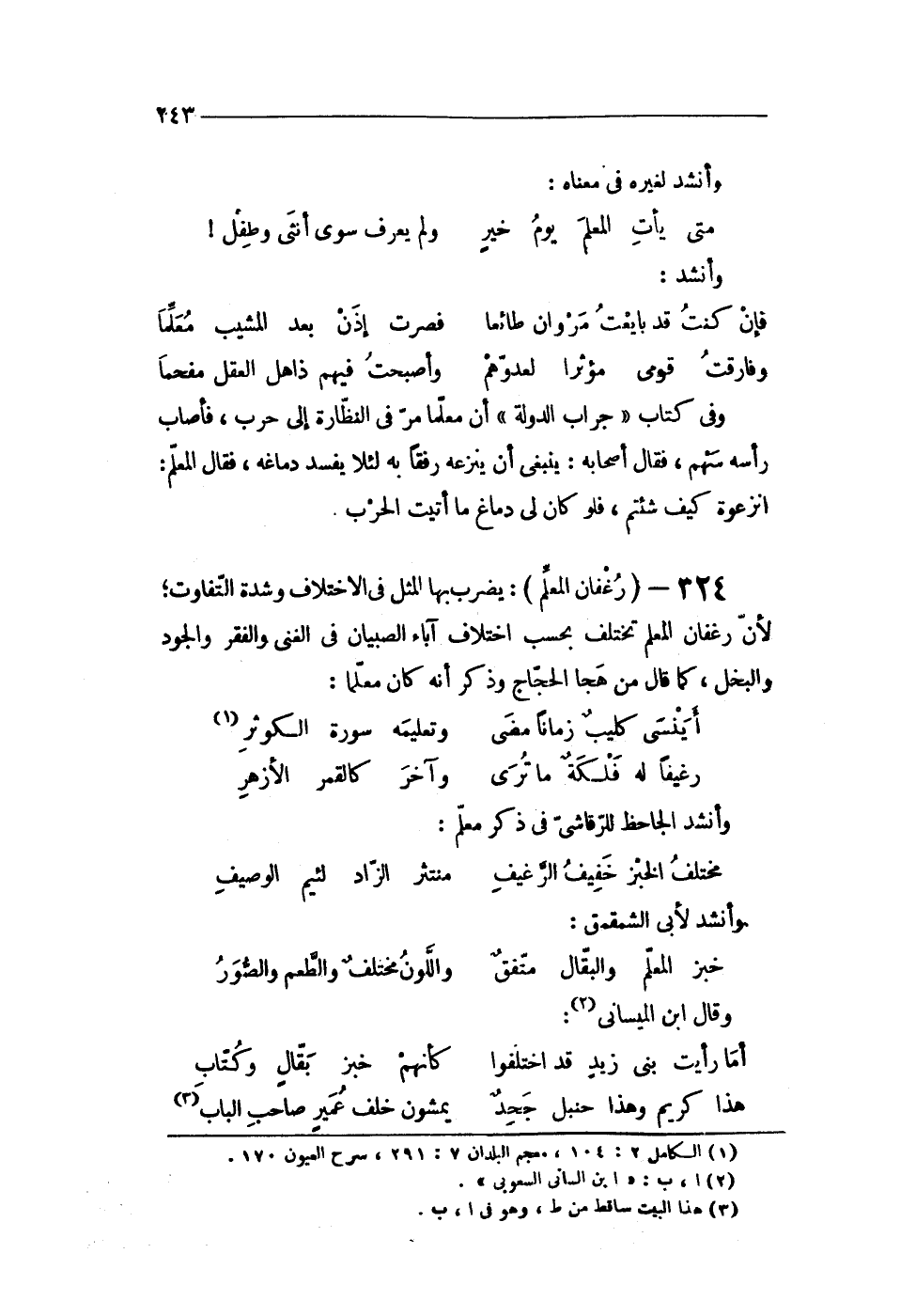 324 - (رغفان الْمعلم) يضْرب بهَا الْمثل فى الِاخْتِلَاف وَشدَّة التَّفَاوُت لِأَن رغفان الْمعلم تخْتَلف تخْتَلف بِحَسب اخْتِلَاف آبَاء الصّبيان فى الْغنى والفقر والجود وَالْبخل كَمَا قَالَ من هجا الْحجَّاج وَذكر أَنه كَانَ معلما