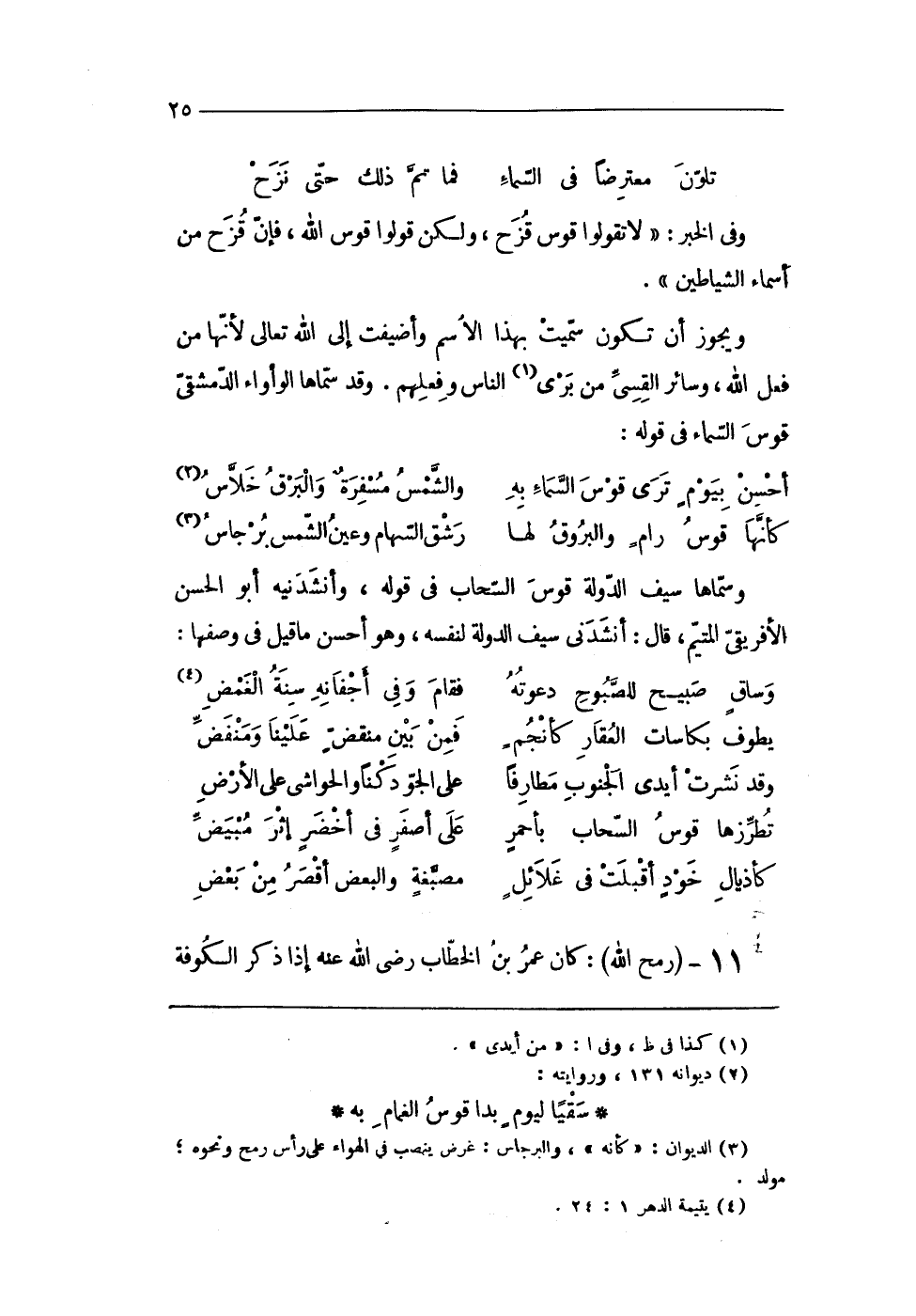 وسماها سيف الدولة قَوس السَّحَاب فِي قَوْله وأنشدنيه ابو الْحسن الأفريقى المتيم قَالَ أنشدنى سيف الدولة لنَفسِهِ وَهُوَ أحسن مَا قيل فِي وصفهَا