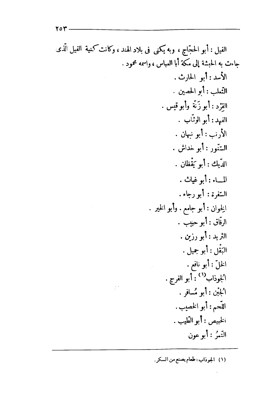 الْفِيل ابو الْحجَّاج وَبِه يكنى فى بِلَاد الْهِنْد وَكَانَت كنية الْفِيل الذى جَاءَت بِهِ الْحَبَشَة إِلَى مَكَّة ابا الْعَبَّاس واسْمه مَحْمُود