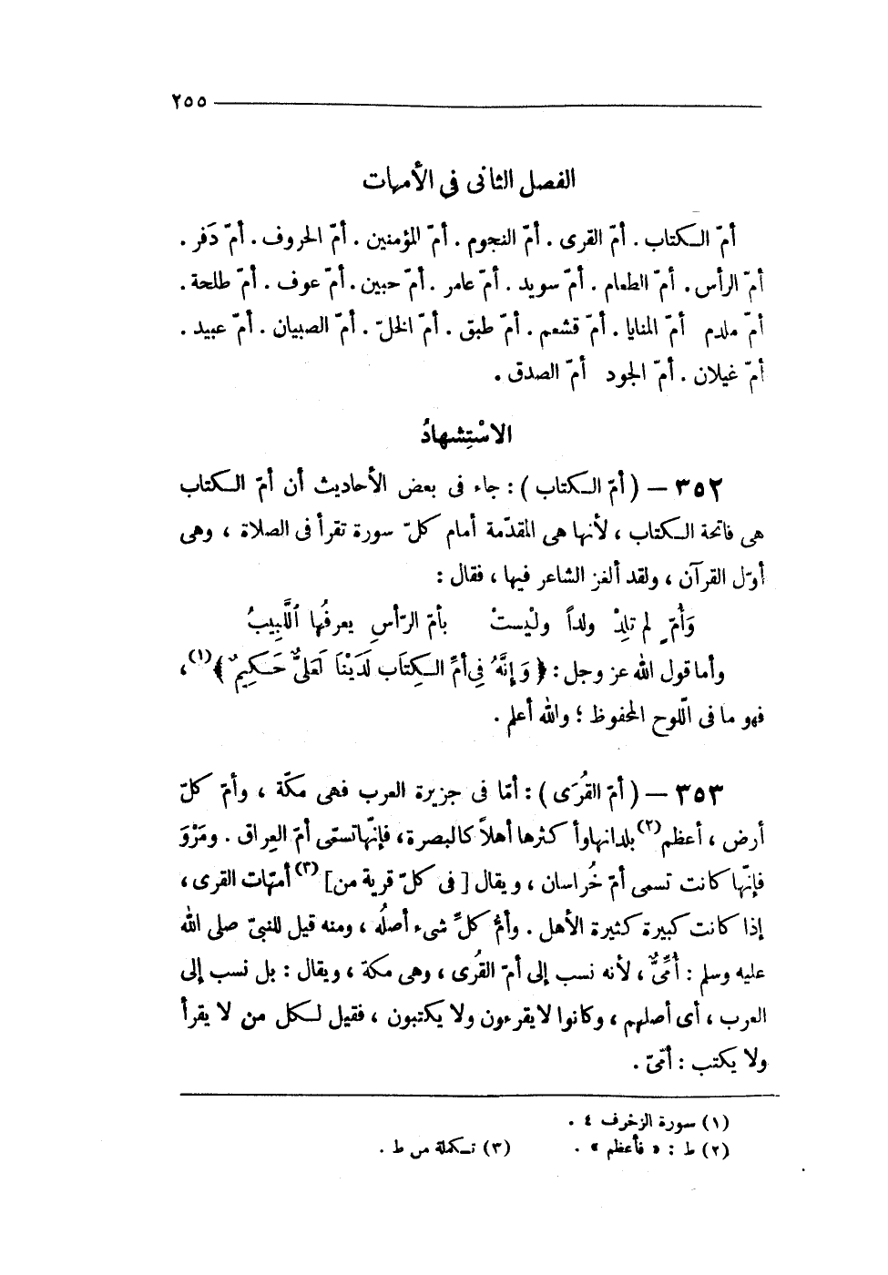 353 - (أم الْقرى) أما فى جَزِيرَة الْعَرَب فهى مَكَّة وَأم كل أَرض أعظم بلدانها وأكثرها أَهلا كالبصرة فَإِنَّهَا تسمى أم الْعرَاق ومرو فَإِنَّهَا كَانَت تسمى أم خُرَاسَان وَيُقَال فى كل قَرْيَة من أُمَّهَات الْقرى إِذا كَانَت كَبِيرَة كَثِيرَة الْأَهْل وَأم كل شئ أَصله وَمِنْه قيل للنبى صلى الله عَلَيْهِ وَسلم أمى لِأَنَّهُ نسب إِلَى أم الْقرى وهى مَكَّة وَيُقَال بل نسب إِلَى الْعَرَب أى أصلهم وَكَانُوا لَا يقرءُون وَلَا يَكْتُبُونَ فَقيل لكل من لَا يقْرَأ وَلَا يكْتب أمى