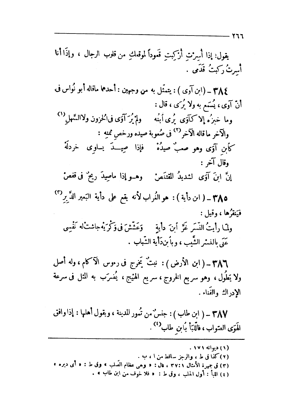 384 - (ابْن آوى) يتَمَثَّل بِهِ من وَجْهَيْن أَحدهمَا مَا قَالَه ابو نواس فى أَن آوى يسمع بِهِ وَلَا يرى قَالَ