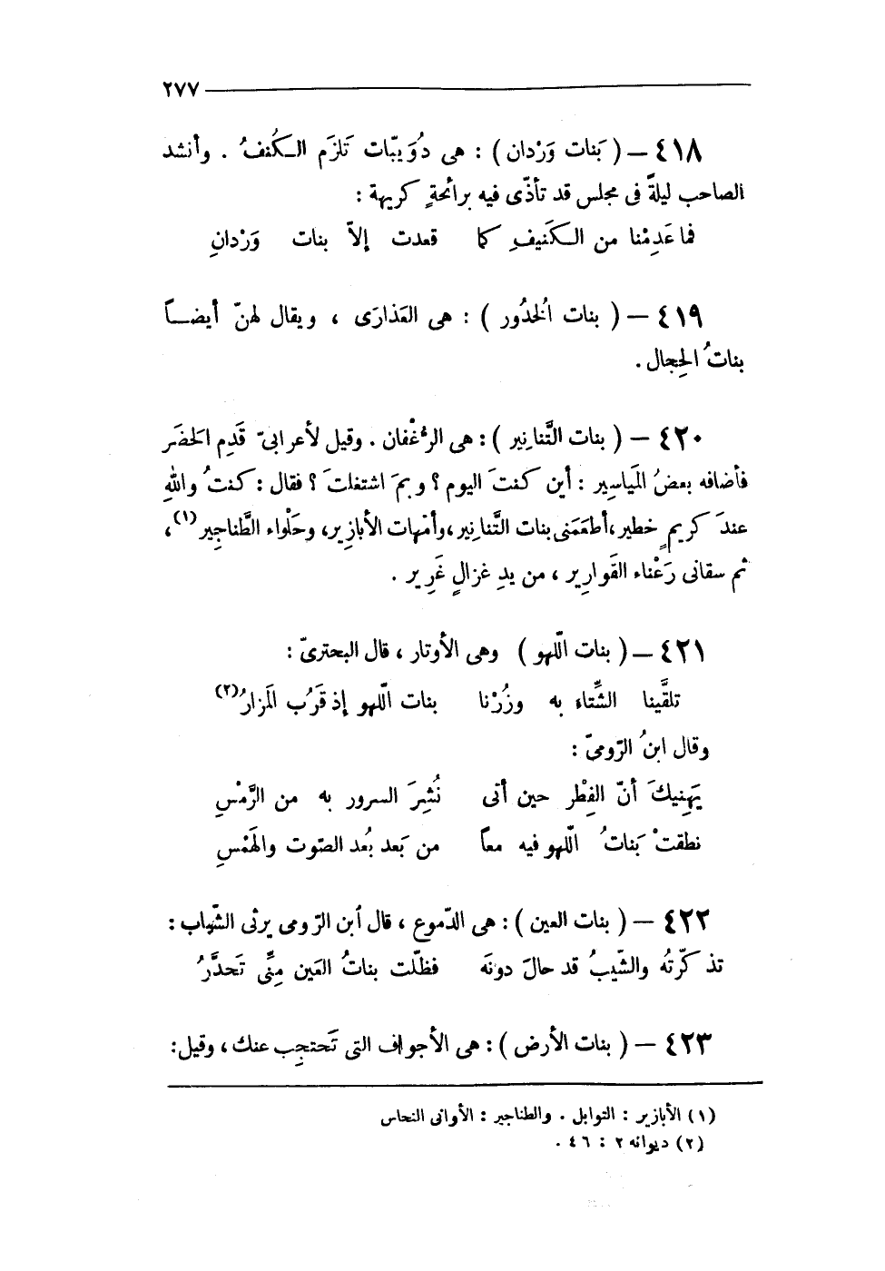 420 - (بَنَات التنانير) هى الرغفان وَقيل لأعرابى قدم الْحَضَر فأضافه بعض المياسير ايْنَ كنت الْيَوْم وَبِمَ اشتغلت فَقَالَ كنت وَالله عِنْد كريم خطير أطعمنى بَنَات التنانير وَأُمَّهَات الأبازير وحلواء الطناجير ثمَّ سقانى رعناء الْقَوَارِير من يَد غزال غرير