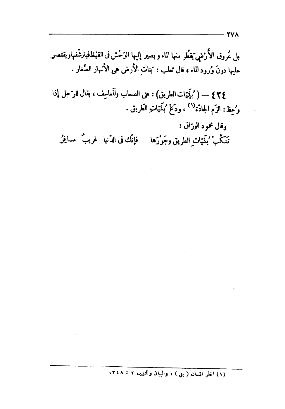 424 - (بنيات الطَّرِيق) هى الصعاب والمعاسف يُقَال للرجل إِذا وعظ الزم الجادة ودع بنيات الطَّرِيق