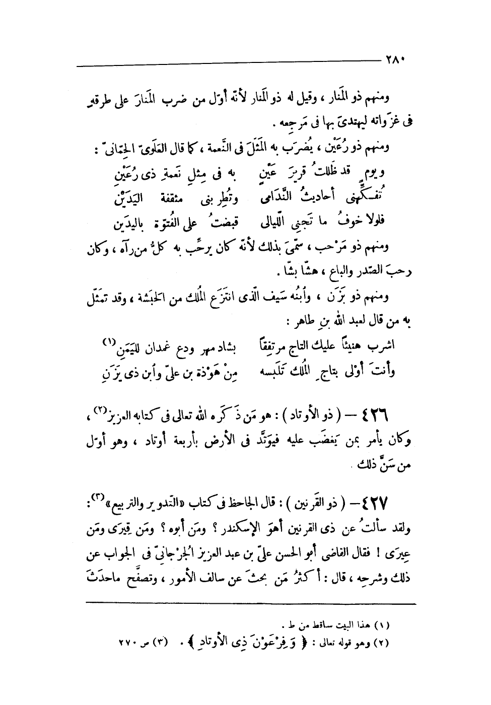 427 - (ذُو القرنين) قَالَ الجاحظ فى كتاب التدوير والتربيع وَلَقَد سَأَلت عَن ذى القرنين أهوَ الْإِسْكَنْدَر وَمن أَبوهُ وَمن قيرى وَمن عيرى فَقَالَ القاضى أَبُو الْحسن على بن عبد الْعَزِيز الجرجانى فى الْجَواب عَن ذَلِك وَشَرحه قَالَ أَكثر من بحث عَن سالف الْأُمُور وتصفح مَا حدث