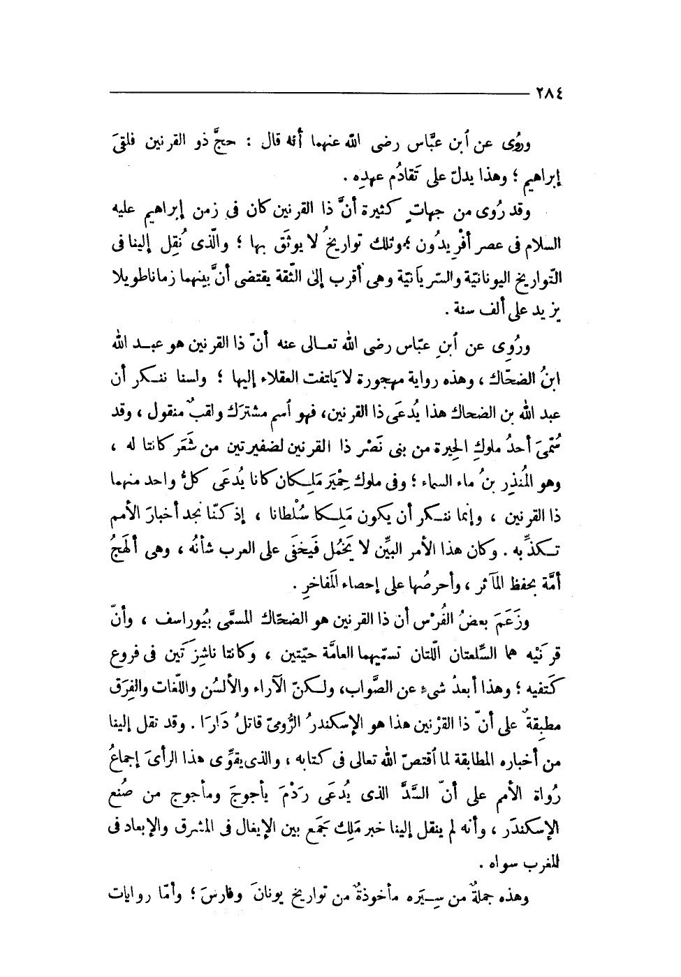 وروى عَن ابْن عَبَّاس رضى الله تَعَالَى عَنهُ أَن ذَا القرنين هُوَ عبد الله ابْن الضَّحَّاك وَهَذِه رِوَايَة مهجورة لَا يلْتَفت الْعُقَلَاء إِلَيْهَا ولسنا ننكر أَن عبد الله بن الضَّحَّاك هَذَا يدعى ذَا القرنين فَهُوَ اسْم مُشْتَرك ولقب مَنْقُول وَقد سمى أحد مُلُوك الْحيرَة من بنى نصر ذَا القرنين لضفيرتين من شعركانتا لَهُ وَهُوَ الْمُنْذر بن مَاء السَّمَاء وفى مُلُوك حمير ملكان كَانَا يدعى كل وَاحِد مِنْهُمَا ذَا القرنين وَإِنَّمَا ننكر أَن يكون ملكا سُلْطَانا إِذْ كُنَّا نجد أَخْبَار الْأُمَم تكذبه وَكَانَ هَذَا الْأَمر الْبَين لَا يخمل فيخفى على الْعَرَب شَأْنه وهى ألهج أمة بِحِفْظ المآثر وأحرصها على إحصاء المفاخر