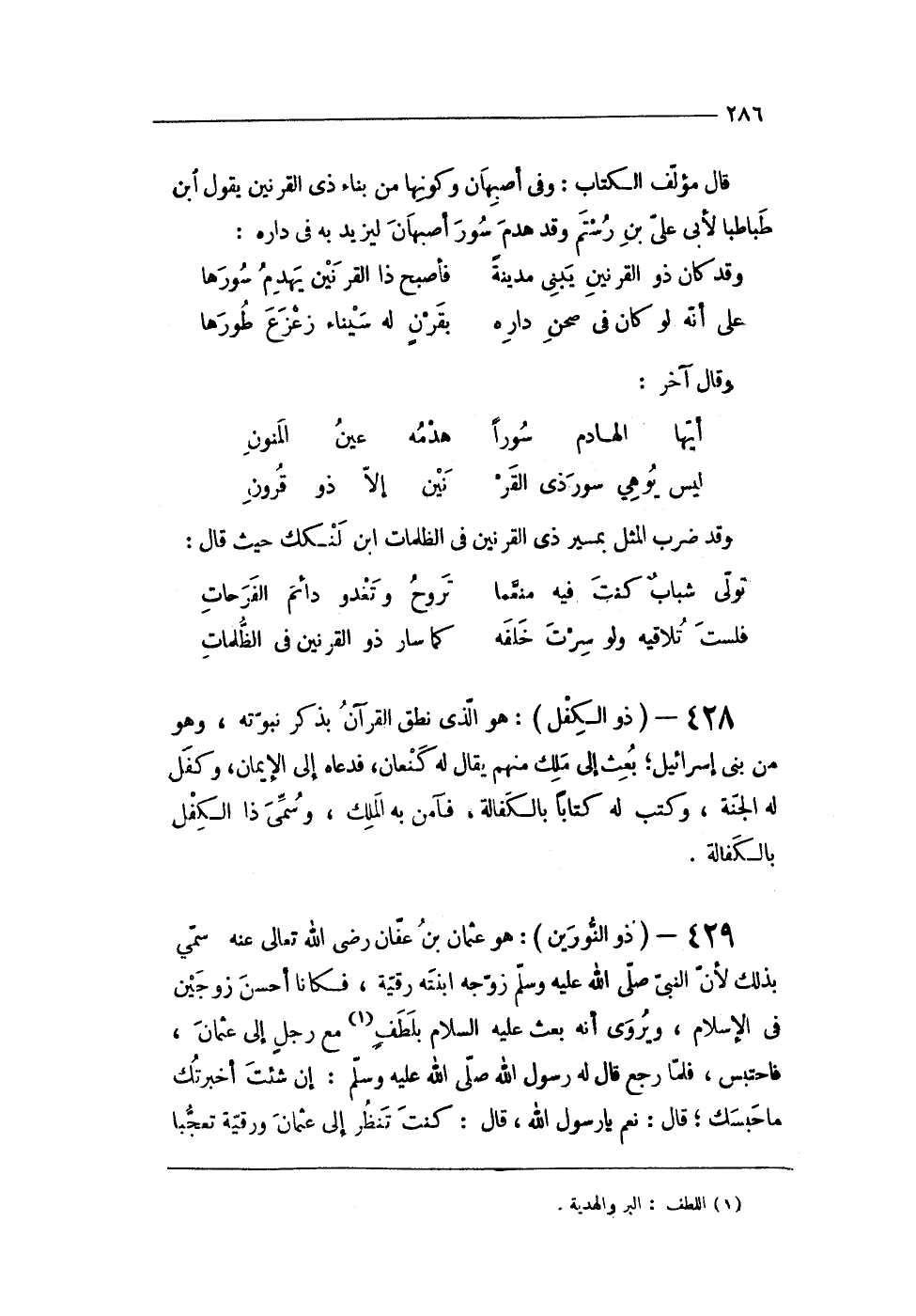 428 - (ذُو الكفل) هُوَ الذى نطق الْقُرْآن بِذكر نبوته وَهُوَ من بنى إِسْرَائِيل بعث إِلَى ملك مِنْهُم يُقَال لَهُ كنعان فَدَعَاهُ إِلَى الْإِيمَان وكفل لَهُ الْجنَّة وَكتب لَهُ كتابا بِالْكَفَالَةِ فَآمن بِهِ الْملك وسمى ذَا الكفل بِالْكَفَالَةِ