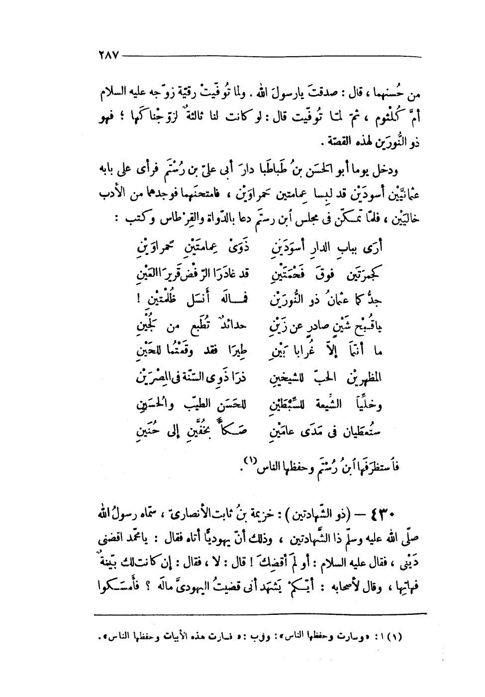 430 - (ذُو الشَّهَادَتَيْنِ) خُزَيْمَة بن ثَابت الأنصارى سَمَّاهُ رَسُول الله صلى الله عَلَيْهِ وَسلم ذَا الشَّهَادَتَيْنِ وَذَلِكَ أَن يَهُودِيّا أَتَاهُ فَقَالَ يَا مُحَمَّد اقضنى دينى فَقَالَ صلى الله عَلَيْهِ وَسلم أَو لم أقضك قَالَ لَا فَقَالَ إِن كَانَت لَك بَيِّنَة فهاتها وَقَالَ لأَصْحَابه ايكم يشْهد أَنى قضيت اليهودى مَاله فأمسكوا
