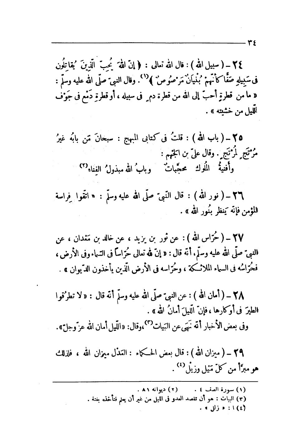 24 - (سَبِيل الله) قَالَ الله تَعَالَى {إِن الله يحب الَّذين يُقَاتلُون فِي سَبيله صفا كَأَنَّهُمْ بُنيان مرصوص} وَقَالَ النَّبِي صلى الله عَلَيْهِ وَسلم (مَا من قَطْرَة أحب إِلَى الله من قَطْرَة دم فِي سَبيله أَو قَطْرَة دمع فِي جَوف اللَّيْل من خَشيته)