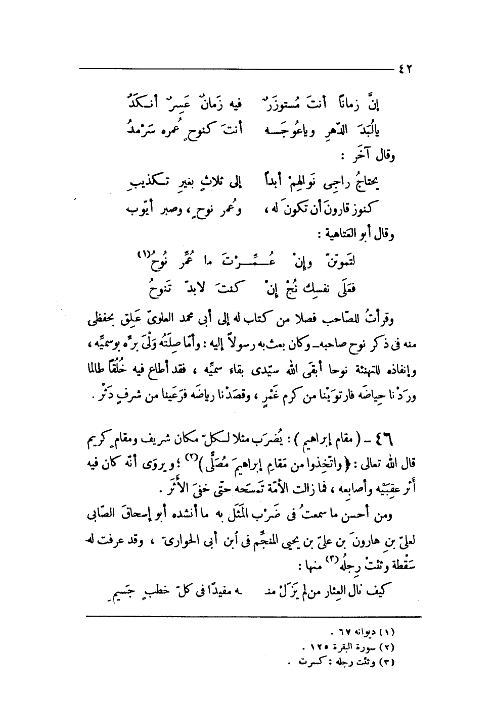 46 - (مقَام إِبْرَاهِيم) يضْرب مثلا لكل مَكَان شرِيف ومقام كريم قَالَ الله تَعَالَى {وَاتَّخذُوا من مقَام إِبْرَاهِيم مصلى} ويروى أَنه كَانَ فِيهِ أثر عَقِبَيْهِ وأصابعه فَمَا زَالَت الْأمة تمسحه حَتَّى خفى الْأَثر