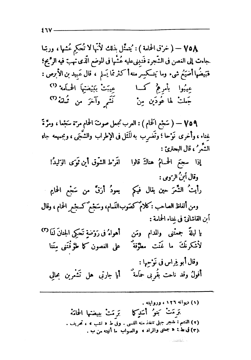 759 - (سجع الْحمام) الْعَرَب تجْعَل صَوت الْحمام مرّة سجعا وَمرَّة غناء وَأُخْرَى نوحًا وتضرب بِهِ الْمثل فى الإطراب والشجى وبجميعه جَاءَ الشّعْر قَالَ البحترى