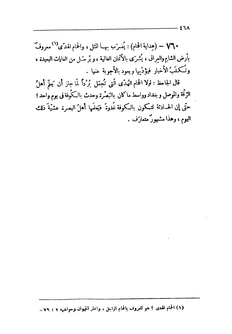 760 - (هِدَايَة الْحمام) يضْرب بهَا الْمثل وَالْحمام الْهدى مَعْرُوف بِأَرْض الشَّام وَالْعراق يشرى بالأثمان الغالية وَيُرْسل من الغايات الْبَعِيدَة وتكتب الْأَخْبَار فيؤديها وَيعود بالأجوبة عَنْهَا