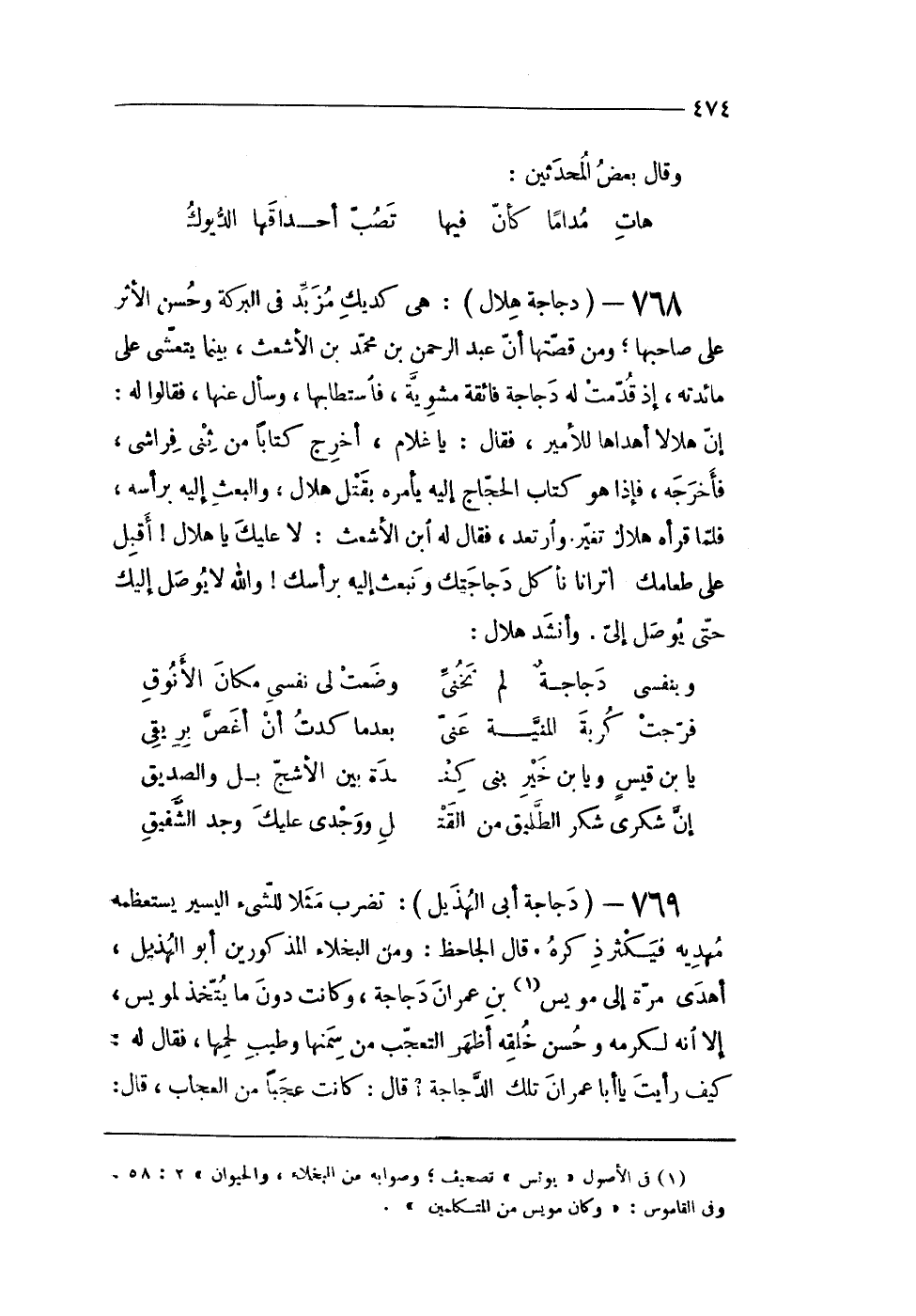 768 - (دجَاجَة هِلَال) هى كديك مُزْبِد فى الْبركَة وَحسن الْأَثر على صَاحبهَا وَمن قصَّتهَا أَن عبد الرَّحْمَن بن مُحَمَّد بن الْأَشْعَث بَيْنَمَا يتعشى على مائدته إِذْ قدمت لَهُ دجَاجَة فائقة مشوية فاستطابها وَسَأَلَ عَنْهَا فَقَالُوا لَهُ ان هلالا أهداها للأمير فَقَالَ يَا غُلَام أخرج كتابا من ثنى فراشى فَأخْرجهُ فَإِذا هُوَ كتاب الْحجَّاج إِلَيْهِ يَأْمُرهُ بقتل هِلَال والبعث إِلَيْهِ بِرَأْسِهِ فَلَمَّا قَرَأَهُ هِلَال تغير وارتعد فَقَالَ لَهُ ابْن الْأَشْعَث لَا عَلَيْك يَا هِلَال أقبل على طَعَامك اترانا نَأْكُل دجاجتك ونبعث إِلَيْهِ برأسك وَالله لَا يُوصل إِلَيْك حَتَّى يُوصل إِلَى وَأنْشد هِلَال
