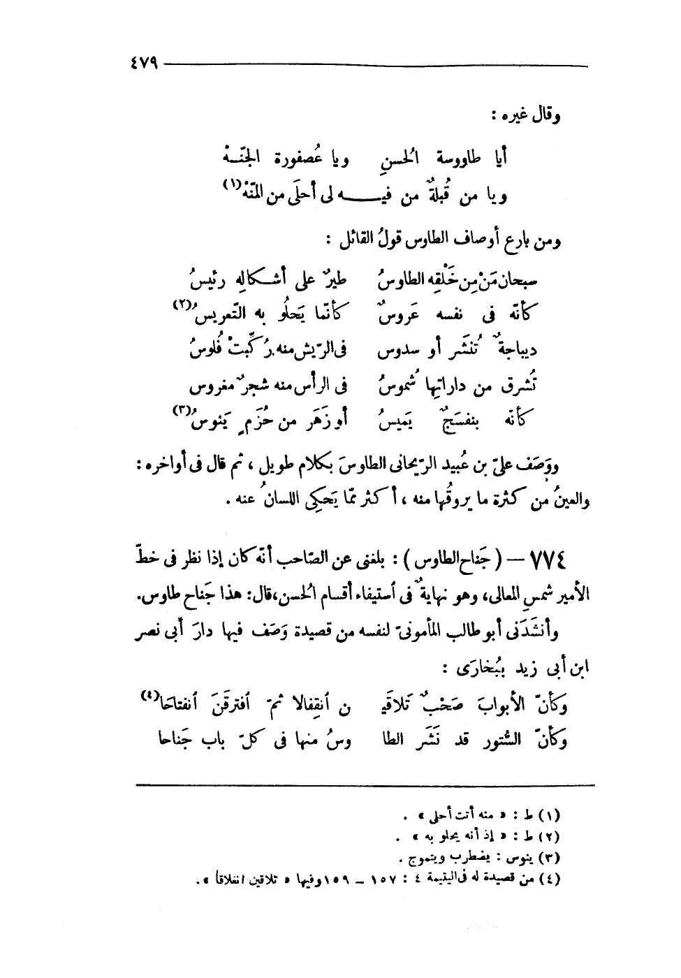 774 - (جنَاح الطاوس) بلغنى عَن الصاحب أَنه كَانَ إِذا نظر فى خطّ الْأَمِير شمس المعالى وَهُوَ نِهَايَة فى اسْتِيفَاء أَقسَام الْحسن قَالَ هَذَا جنَاح طَاوس