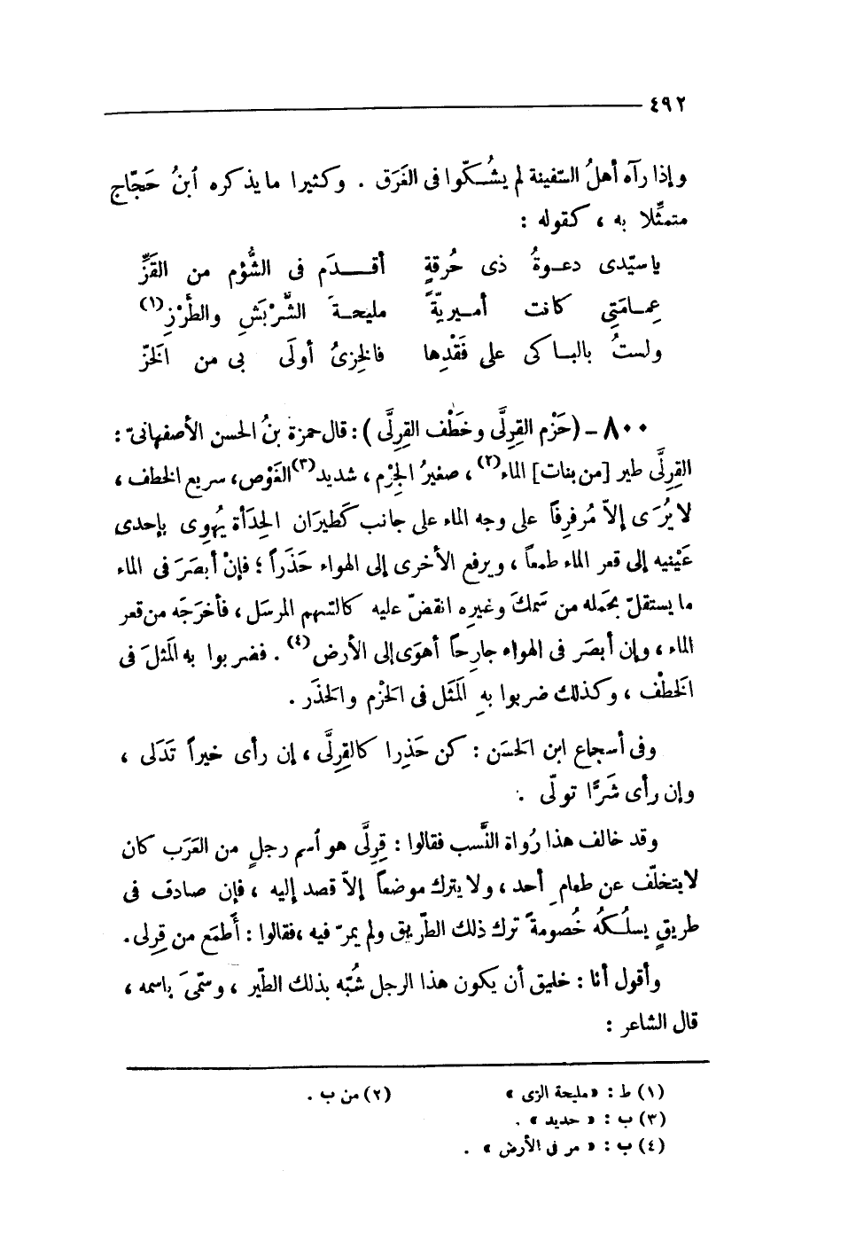800 - (حزم القرلى وخطف القرلى) قَالَ حَمْزَة بن الْحسن الأصفهانى القرلى طير من بَنَات المَاء صَغِير الجرم شَدِيد الغوص سريع الخطف لَا يرى إِلَّا مرفرفا على وَجه المَاء على جَانب كطيران الحدأة يهوى بِإِحْدَى عَيْنَيْهِ إِلَى قَعْر المَاء طَمَعا وَيرْفَع الْأُخْرَى إِلَى الْهَوَاء حذرا فَإِن أبْصر فى المَاء مَا يسْتَقلّ بِحمْلِهِ من سمك وَغَيره انقض عَلَيْهِ كالسهم الْمُرْسل فَأخْرجهُ من قَعْر المَاء وَإِن أبْصر فى الْهَوَاء جارحا أَهْوى إِلَى الأَرْض فَضربُوا بِهِ الْمثل فى الخطف وَكَذَلِكَ ضربوا بِهِ الْمثل فى الحزم والحذر