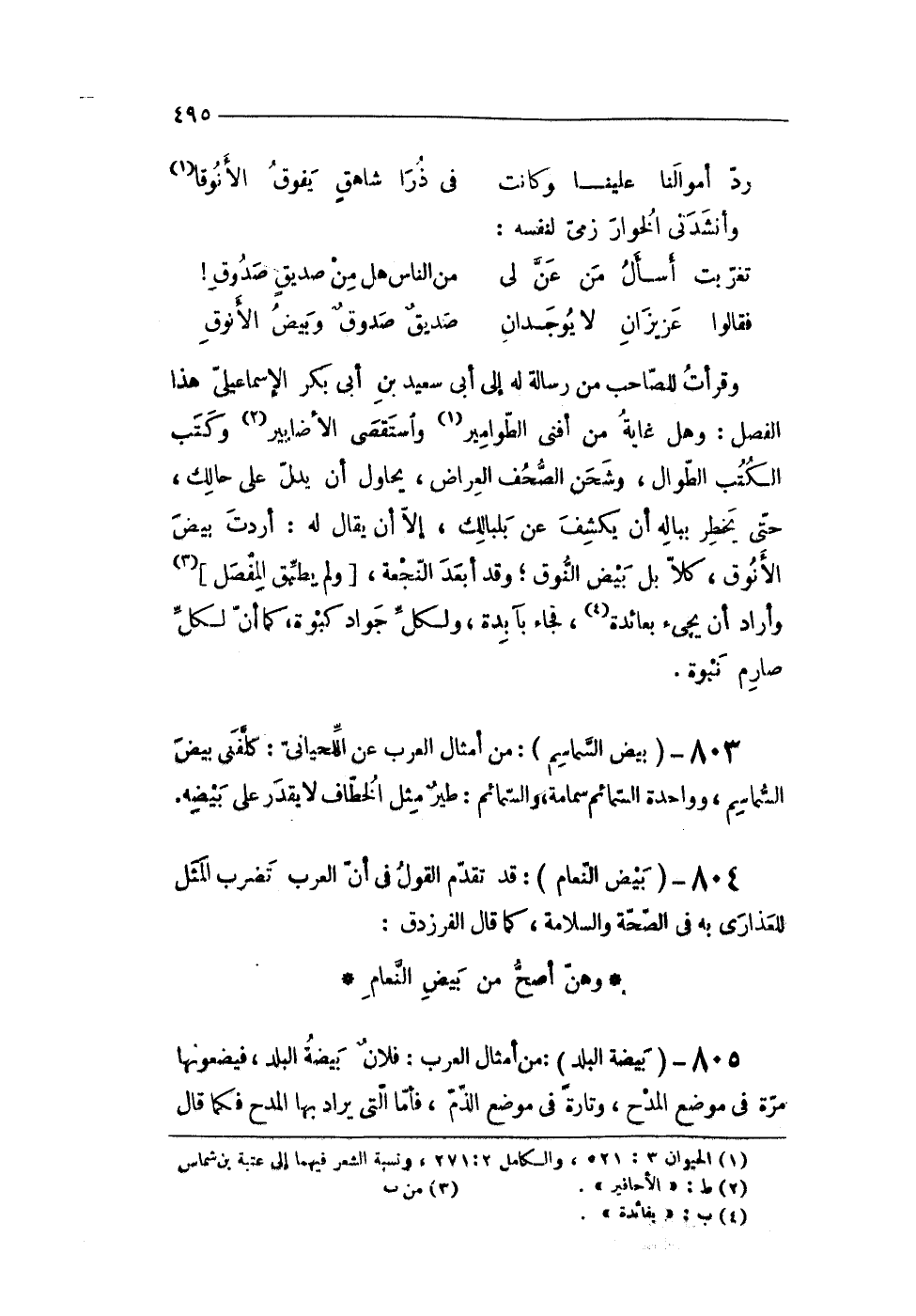 805 - (بَيْضَة الْبَلَد) من أَمْثَال الْعَرَب فلَان بَيْضَة الْبَلَد فيضعونها مرّة فى مَوضِع الْمَدْح وَتارَة فى مَوضِع الذَّم فَأَما الَّتِى يُرَاد بهَا الْمَدْح فَكَمَا قَالَ