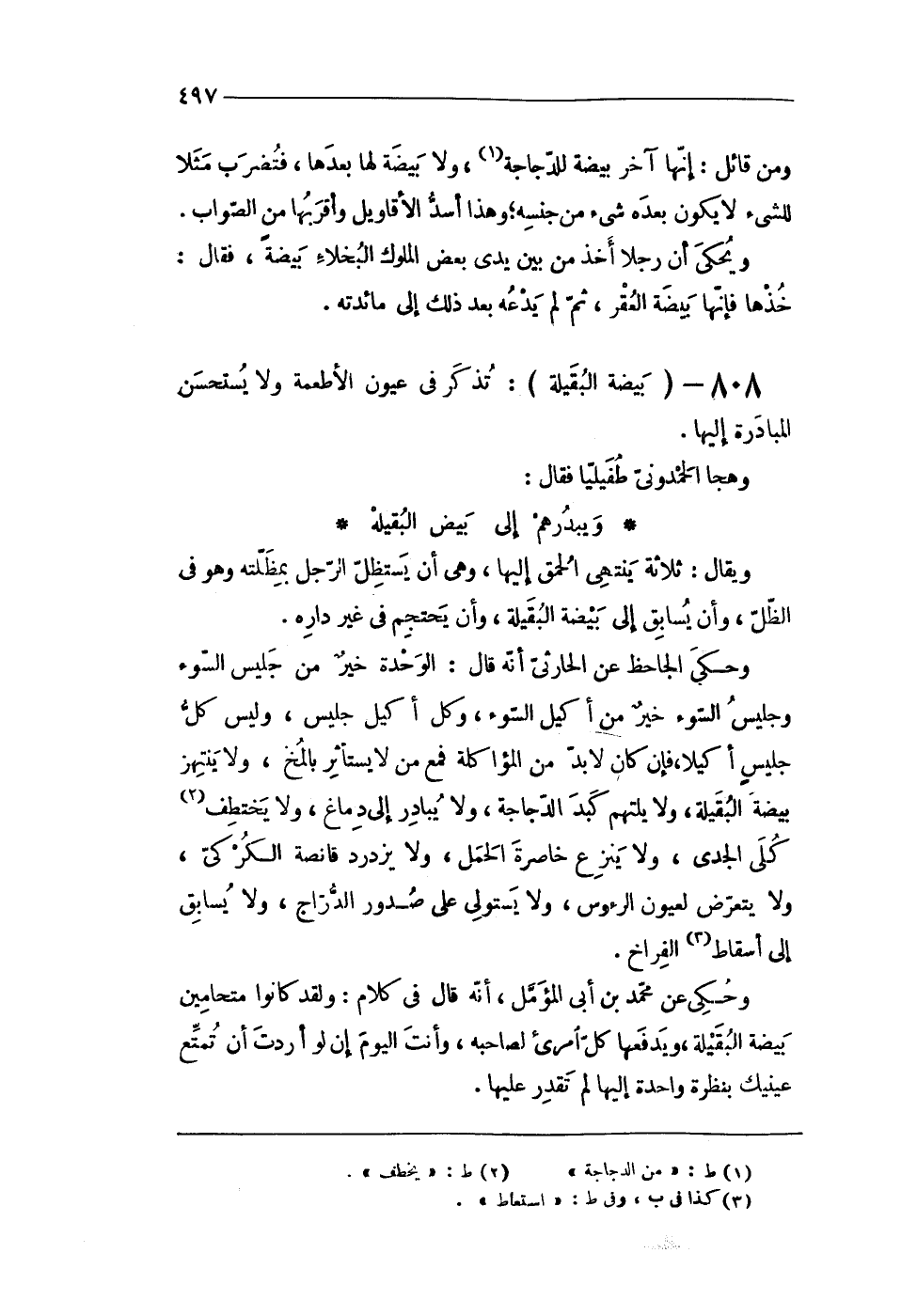 808 - (بَيْضَة البقيلة) تذكر فى عُيُون الْأَطْعِمَة وَلَا يستحسن الْمُبَادرَة إِلَيْهَا