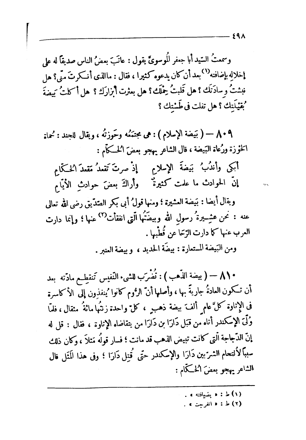 809 - (بَيْضَة الْإِسْلَام) هى مجتمعه وحوزته وَيُقَال للجند حماة الْحَوْزَة ورعاة الْبَيْضَة قَالَ الشَّاعِر يهجو بعض الْحُكَّام