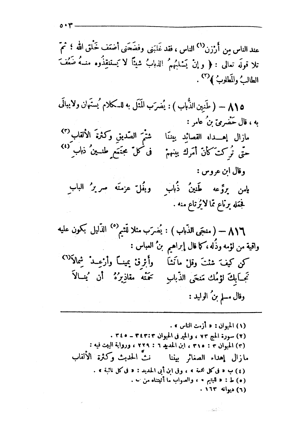 816 - (منجى الذُّبَاب) يضْرب مثلا للئيم الذَّلِيل يكون عَلَيْهِ واقية من لؤمه وذله كَمَا قَالَ إِبْرَاهِيم بن الْعَبَّاس