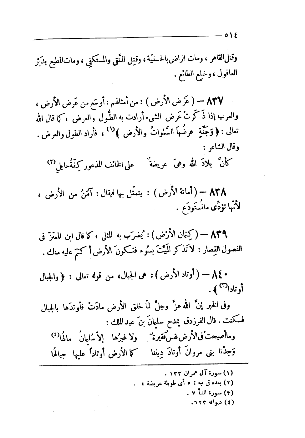 837 - (عرض الأَرْض) من أمثالهم أوسع من عرض الأَرْض وَالْعرب إِذا ذكرت عرض الشىء أَرَادَت بِهِ الطول وَالْعرض كَمَا قَالَ الله تَعَالَى {وجنة عرضهَا السَّمَاوَات وَالْأَرْض} فَأَرَادَ الطول وَالْعرض وَقَالَ الشَّاعِر