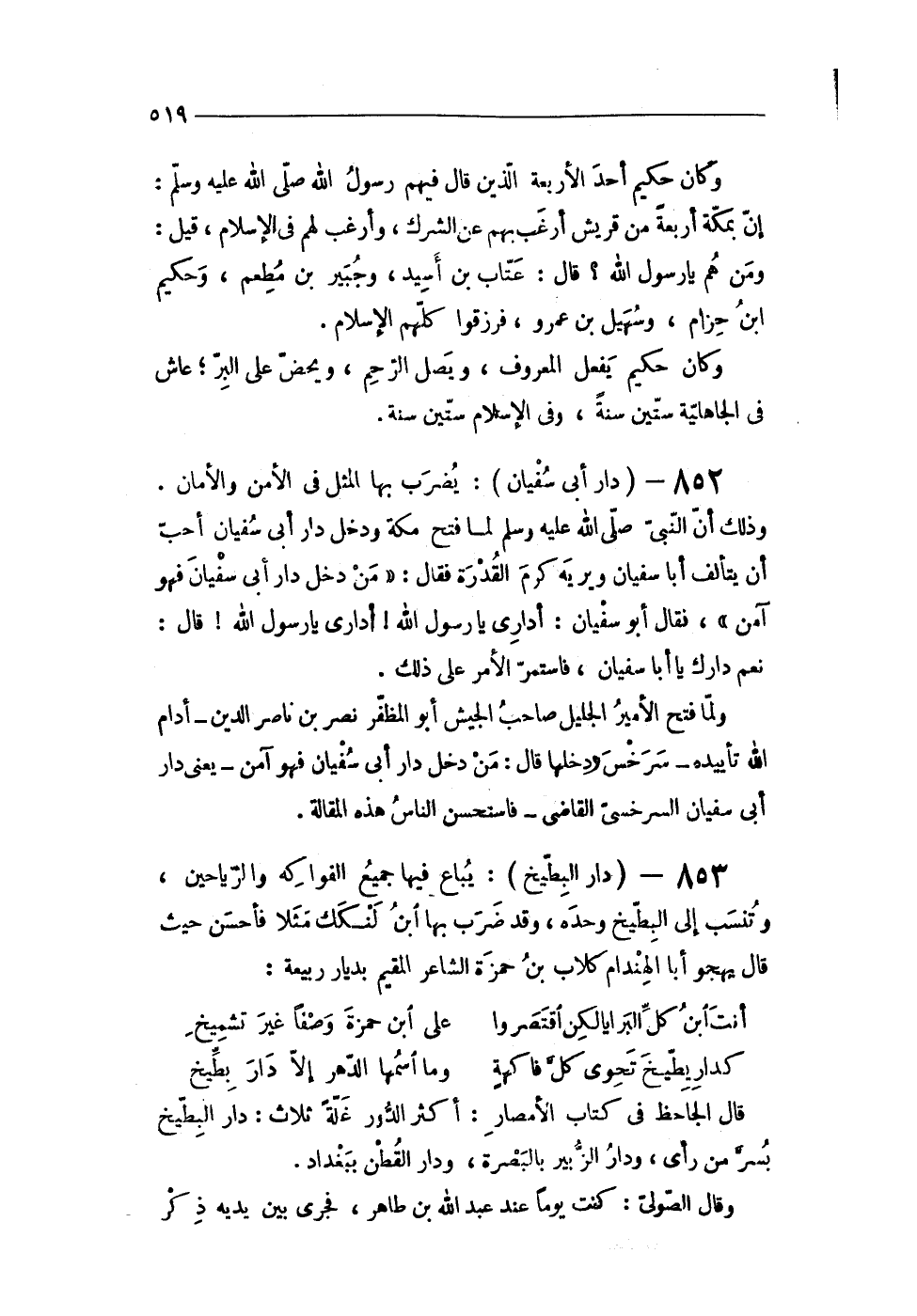 853 - (دَار الْبِطِّيخ) يُبَاع فِيهَا جَمِيع الْفَوَاكِه والرياحين وتنسب إِلَى الْبِطِّيخ وَحده وَقد ضرب بهَا ابْن لنكك مثلا فَأحْسن حَيْثُ قَالَ يهجو أَبَا الهندام كلاب بن حَمْزَة الشَّاعِر الْمُقِيم بديار ربيعَة