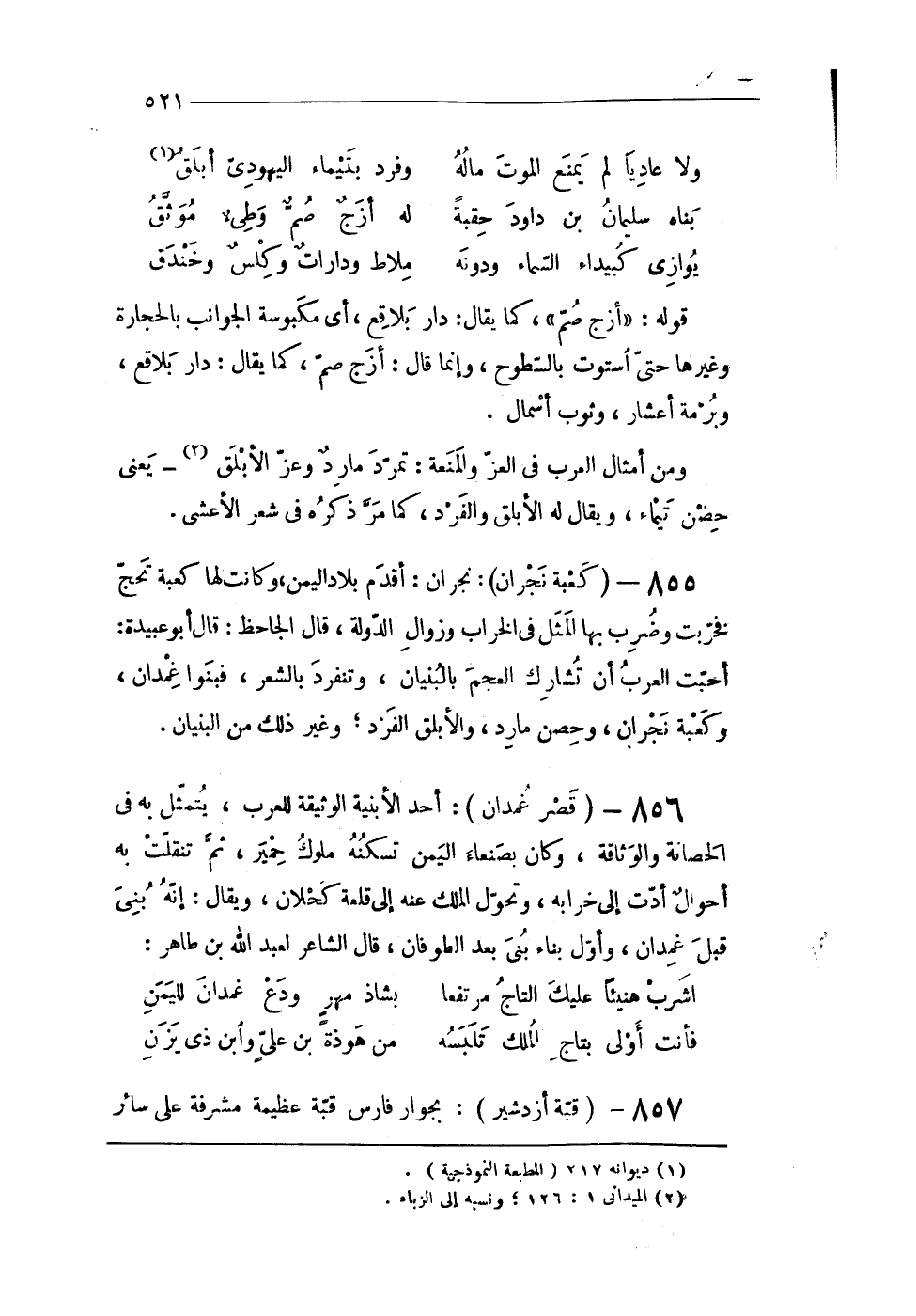 856 - (قصر غمدان) أحد الْأَبْنِيَة الْوَثِيقَة للْعَرَب يتَمَثَّل بِهِ فى الحصانة والوثاقة وَكَانَ بِصَنْعَاء الْيمن تسكنه مُلُوك حمير ثمَّ تنقلت بِهِ أَحْوَال أدَّت إِلَى خرابه وتحول الْملك عَنهُ إِلَى قلعة كحلان وَيُقَال إِنَّه بنى قبل غمدان وَأول بِنَاء بنى بعد الطوفان قَالَ الشَّاعِر لعبد الله بن طَاهِر