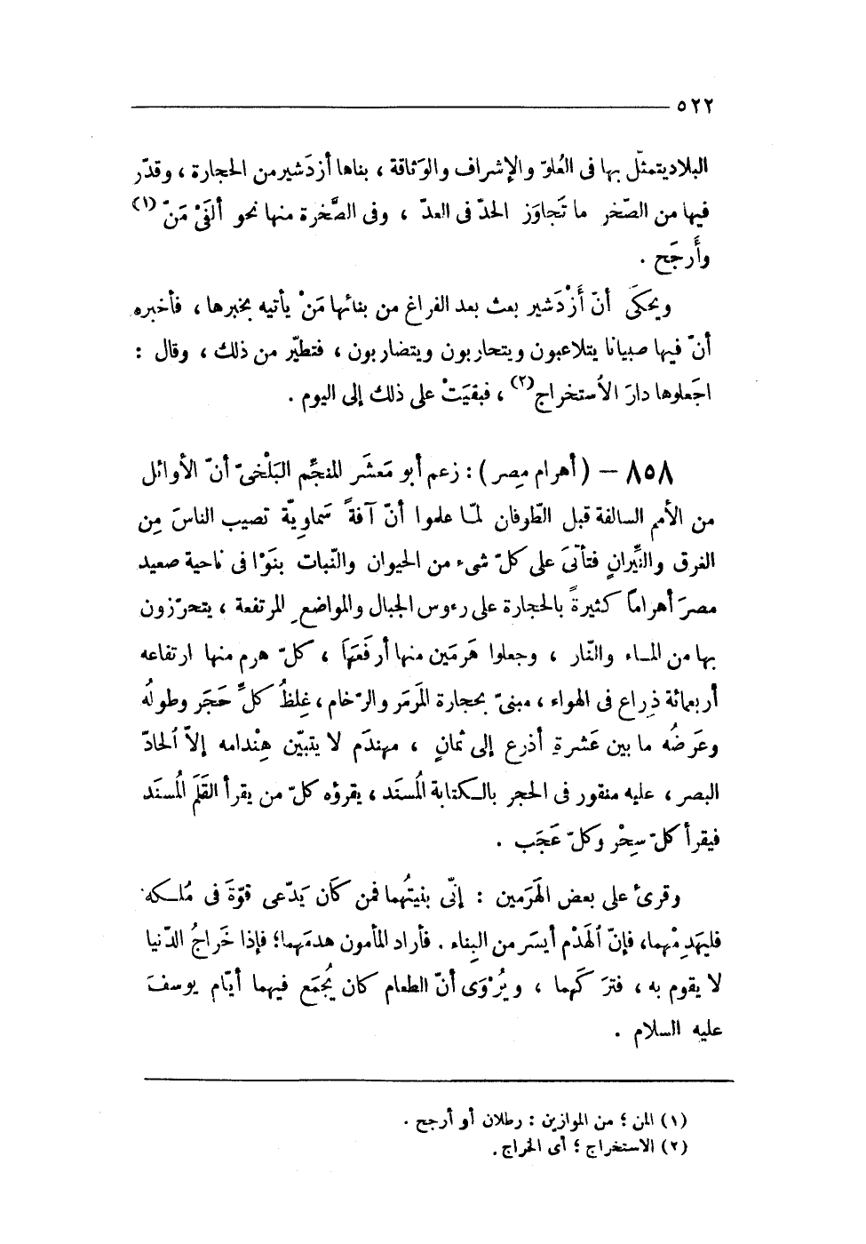 858 - (أهرام مصر) زعم أَبُو معشر المنجم البلخى أَن الْأَوَائِل من الْأُمَم السالفة قبل الطوفان لما علمُوا أَن آفَة سَمَاوِيَّة تصيب النَّاس من الْغَرق والنيران فتأتى على كل شىء من الْحَيَوَان والنبات بنوا فى نَاحيَة صَعِيد مصر أهراما كَثِيرَة بِالْحِجَارَةِ على رُءُوس الْجبَال والمواضع المرتفعة يتحرزون بهَا من المَاء وَالنَّار وَجعلُوا هرمين مِنْهَا أرفعها كل هرم مِنْهَا ارتفاعه أَرْبَعمِائَة ذِرَاع فى الْهَوَاء مبْنى بحجارة المرمر والرخام غلظ كل حجر وَطوله وَعرضه مَا بَين عشرَة أَذْرع إِلَى ثَمَان مهندم لَا يتَبَيَّن هندامه إِلَّا الحاد الْبَصَر عَلَيْهِ منقور فى الْحجر بِالْكِتَابَةِ الْمسند يَقْرَؤُهُ كل من يقْرَأ الْقَلَم الْمسند فَيقْرَأ كل سحر وكل عجب