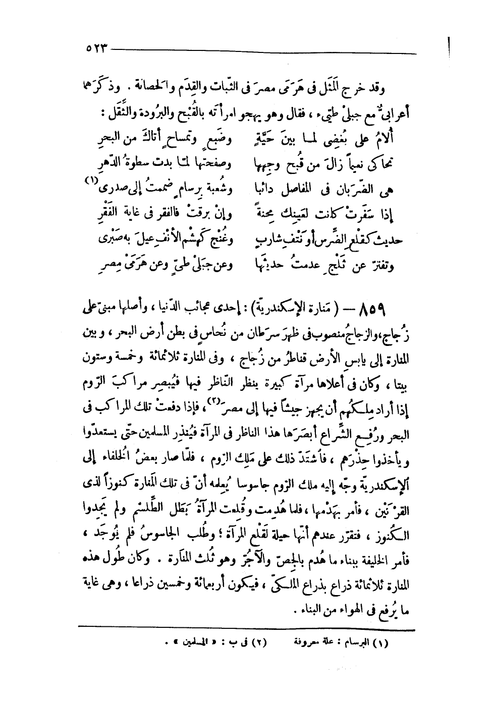 859 - (مَنَارَة الْإسْكَنْدَريَّة) إِحْدَى عجائب الدُّنْيَا وَأَصلهَا مبْنى على زجاج والزجاج مَنْصُوب فى ظهر سرطان من نُحَاس فى بطن أَرض الْبَحْر وَبَين المنارة إِلَى يَابِس الأَرْض قناطر من زجاج وفى المنارة ثَلَاثمِائَة وَخَمْسَة وَسِتُّونَ بَيْتا وَكَانَ فى أَعْلَاهَا مرْآة كَبِيرَة ينظر النَّاظر فِيهَا فيبصر مراكب الرّوم إِذا أَرَادَ ملكهم أَن يُجهز جَيْشًا فِيهَا إِلَى مصر فَإِذا دفعت تِلْكَ المراكب فى الْبَحْر وَرفع الشراع أبصرهَا هَذَا النَّاظر فى الْمرْآة فينذر الْمُسلمين حَتَّى يستعدوا ويأخذوا حذرهم فَاشْتَدَّ ذَلِك على ملك الرّوم فَلَمَّا صَار بعض الْخُلَفَاء إِلَى الْإسْكَنْدَريَّة وَجه إِلَيْهِ ملك الرّوم جاسوسا يُعلمهُ أَن فى تِلْكَ المنارة كنوزا لذى القرنين فَأمر بهدمها فَلَمَّا هدمت وقلعت الْمرْآة بَطل الطلسم وَلم يَجدوا الْكُنُوز فتقرر عِنْدهم أَنَّهَا حِيلَة لقلع الْمرْآة وَطلب الجاسوس فَلم يُوجد فَأمر الْخَلِيفَة بِبِنَاء مَا هدم بالجص والآجر وَهُوَ ثلث المنارة وَكَانَ طول هَذِه المنارة ثَلَاثمِائَة ذِرَاع بِذِرَاع الملكى فَيكون أَرْبَعمِائَة وَخمسين ذِرَاعا وهى غَايَة مَا يرفع فى الْهَوَاء من الْبناء