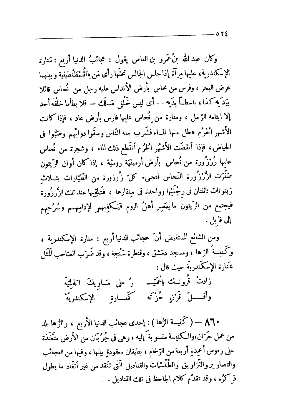 860 - (كَنِيسَة الرها) إِحْدَى عجائب الدُّنْيَا الْأَرْبَع والرها بلد من عمل حران والكنيسة منسوبة إِلَيْهِ وهى فى جربان من الأَرْض متخذة على رُءُوس أعمدة أَرْبَعَة من الرخام بطيقان معقودة بَينهَا وفيهَا من الْعَجَائِب والتصاوير والتزاويق والطلسمات والقناديل الَّتِى تتقد من غير اتقاد مَا يطول ذكره وَقد تقدم كَلَام الجاحظ فى تِلْكَ الْقَنَادِيل