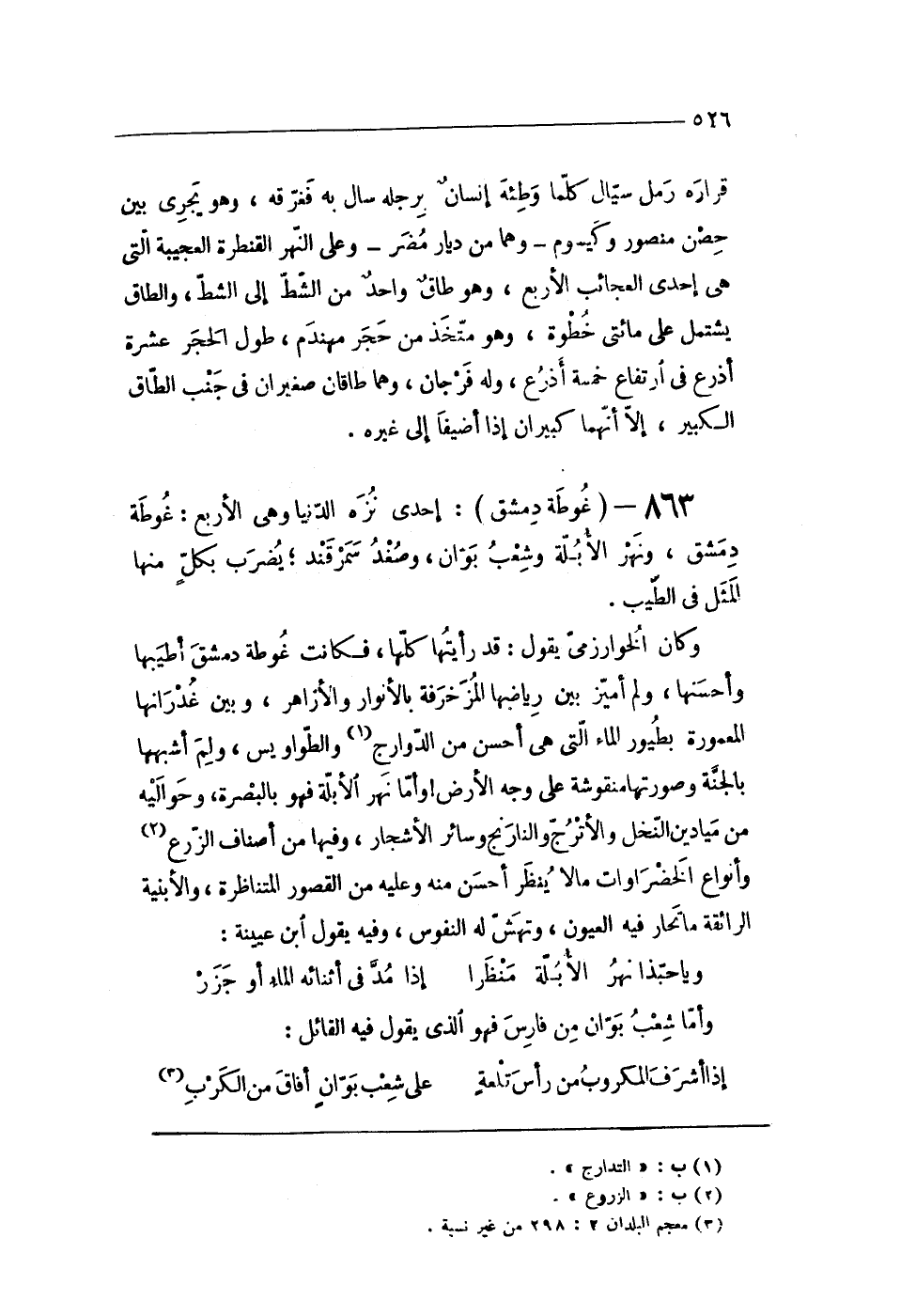 863 - (غوطة دمشق) إِحْدَى نزه الدُّنْيَا وهى الْأَرْبَع غوطة دمشق ونهر الأبلة وَشعب بوان وصغد سَمَرْقَنْد يضْرب بِكُل مِنْهَا الْمثل فى الطّيب