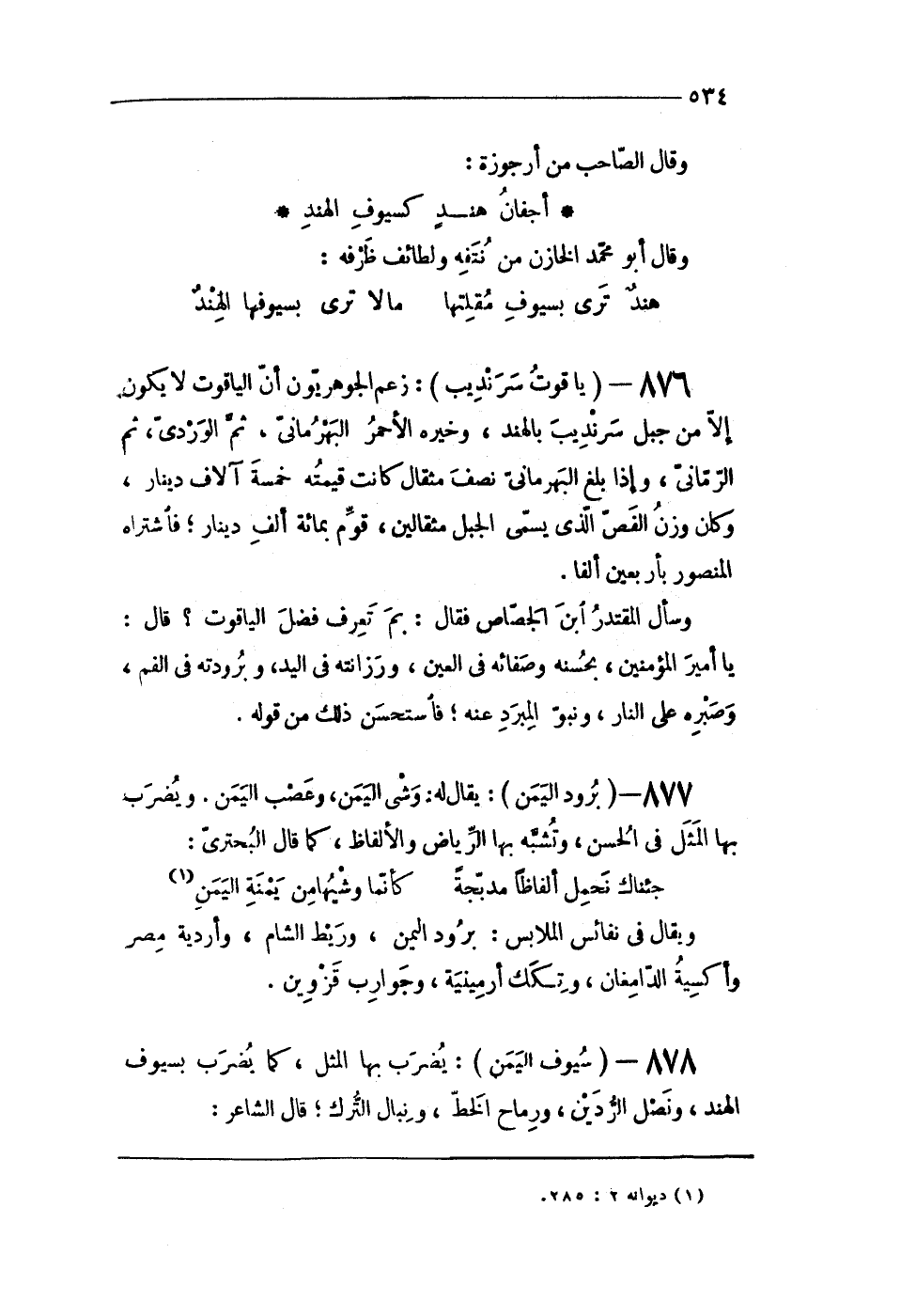 876 - (ياقوت سر نديب) زعم الجوهريون أَن الْيَاقُوت لَا يكون إِلَّا من جبل سر نديب بِالْهِنْدِ وخيره الْأَحْمَر البهرمانى ثمَّ الوردى ثمَّ الرمانى وَإِذا بلغ البهرمانى نصف مِثْقَال كَانَت قِيمَته خَمْسَة آلَاف دِينَار وَكَانَ وزن الفص الذى يُسمى الْجَبَل مثقالين قوم بِمِائَة ألف دِينَار فَاشْتَرَاهُ الْمَنْصُور بِأَرْبَعِينَ ألفا