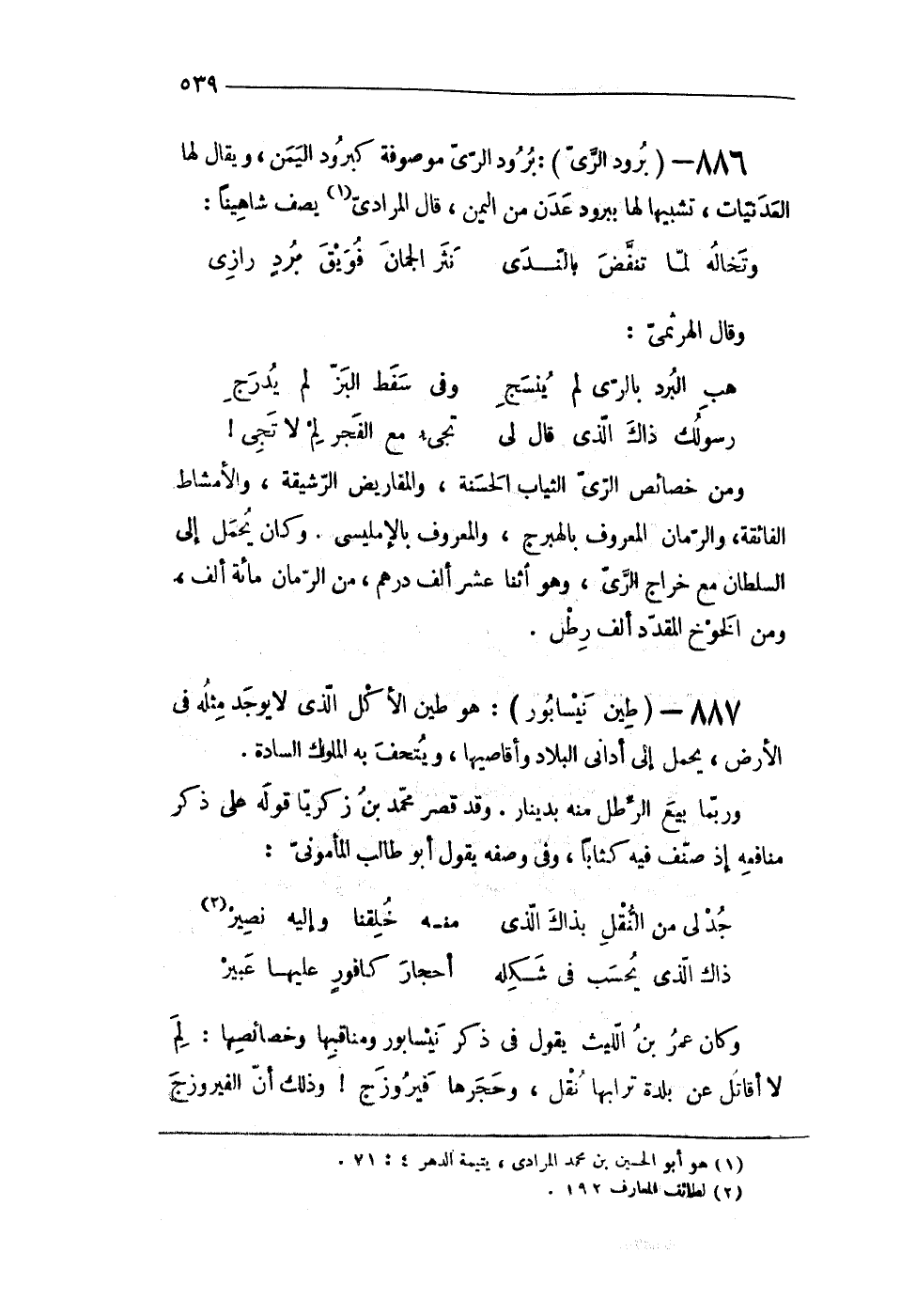 886 - (برود الرى) برود الرى مَوْصُوفَة كبرود الْيمن وَيُقَال لَهَا العدنيات تَشْبِيها لَهَا ببرود عدن من الْيمن قَالَ المرادى يصف شاهينا
