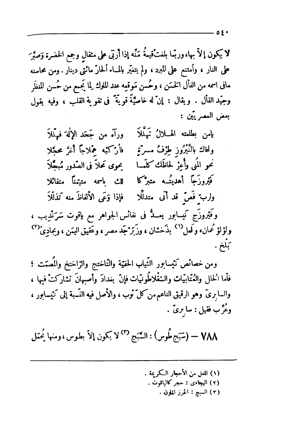 لَا يكون إِلَّا بهَا وَرُبمَا بلغت قيمَة مِنْهُ إِذا أربى على مِثْقَال وَجمع الخضرة وصبر على النَّار وَامْتنع على الْمبرد وَلم يتَغَيَّر بِالْمَاءِ الْحَار مائتى دِينَار وَمن محاسنه مَا فى اسْمه من الفأل الْحسن وَحسن موقعه عِنْد الْمُلُوك لما يجمع من حسن المنظر وجيد الفأل وَيُقَال إِن لَهُ خاصية قَوِيَّة فى تَقْوِيَة الْقلب وَفِيه يَقُول بعض العصريين
