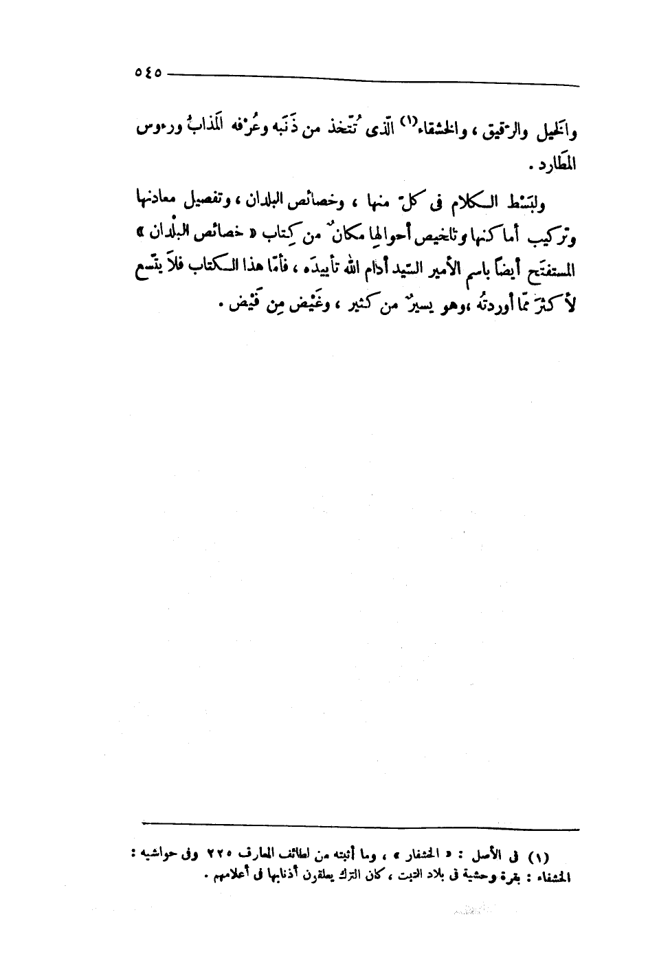 ولبسط الْكَلَام فى كل مِنْهَا وخصائص الْبلدَانِ وتفصيل معادنها وتركيب أماكنها وتلخيص أحوالها مَكَان من كتاب خَصَائِص الْبلدَانِ المستفتح أَيْضا باسم الْأَمِير السَّيِّد أدام الله تأييده فَأَما هَذَا الْكتاب فَلَا يَتَّسِع لأكْثر مِمَّا أوردته وَهُوَ يسير من كثير وغيض من فيض