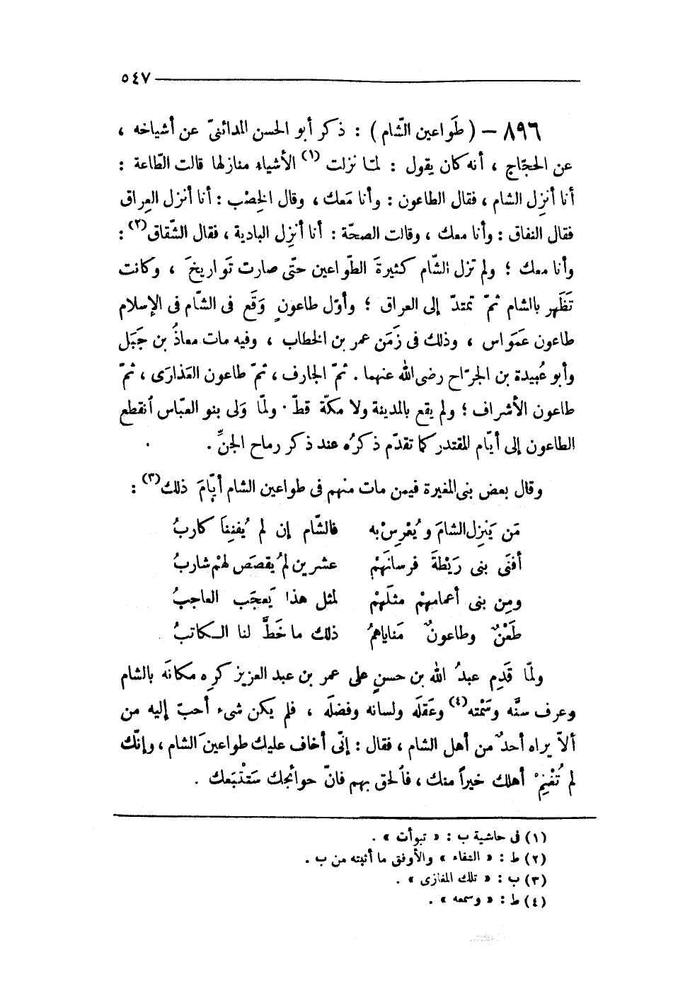 896 - (طواعين الشَّام) ذكر ابو الْحسن المدائنى عَن أشياخه عَن الْحجَّاج أَنه كَانَ يَقُول لما نزلت الْأَشْيَاء منازلها قَالَت الطَّاعَة أَنا أنزل الشَّام فَقَالَ الطَّاعُون وَأَنا مَعَك وَقَالَ الخصب أَنا أنزل الْعرَاق فَقَالَ النِّفَاق وَأَنا مَعَك وَقَالَت الصِّحَّة أَنا أنزل الْبَادِيَة فَقَالَ الشقاق وَأَنا مَعَك وَلم تزل الشَّام كَثِيرَة الطواعين حَتَّى صَارَت تواريخ وَكَانَت تظهر بِالشَّام ثمَّ تمتد إِلَى الْعرَاق وَأول طاعون وَقع فى الشَّام فى الْإِسْلَام طاعون عمواس وَذَلِكَ فى زمن عمر بن الْخطاب وَفِيه مَاتَ معَاذ بن جبل وَأَبُو عُبَيْدَة بن الْجراح رضى الله عَنْهُمَا ثمَّ الجارف ثمَّ طاعون العذارى ثمَّ طاعون الْأَشْرَاف وَلم يَقع بِالْمَدِينَةِ وَلَا مَكَّة قطّ وَلما ولى بَنو الْعَبَّاس انْقَطع الطَّاعُون إِلَى أَيَّام المقتدر كَمَا تقدم ذكره عِنْد ذكر رماح الْجِنّ